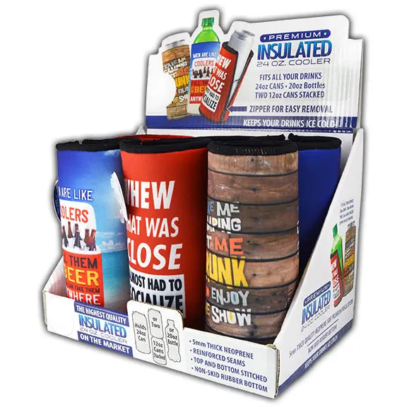 Neoprene can cooler that holds 24oz cans. Has reinforced seams, stitched top and bottoms, and a non-skid rubber base. Comes in assorted designs.