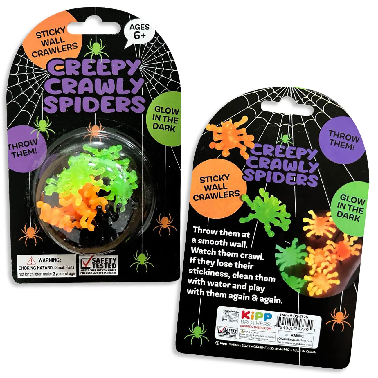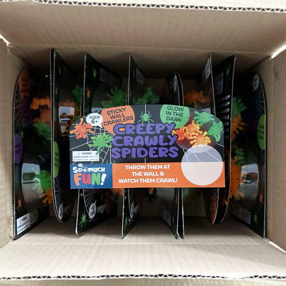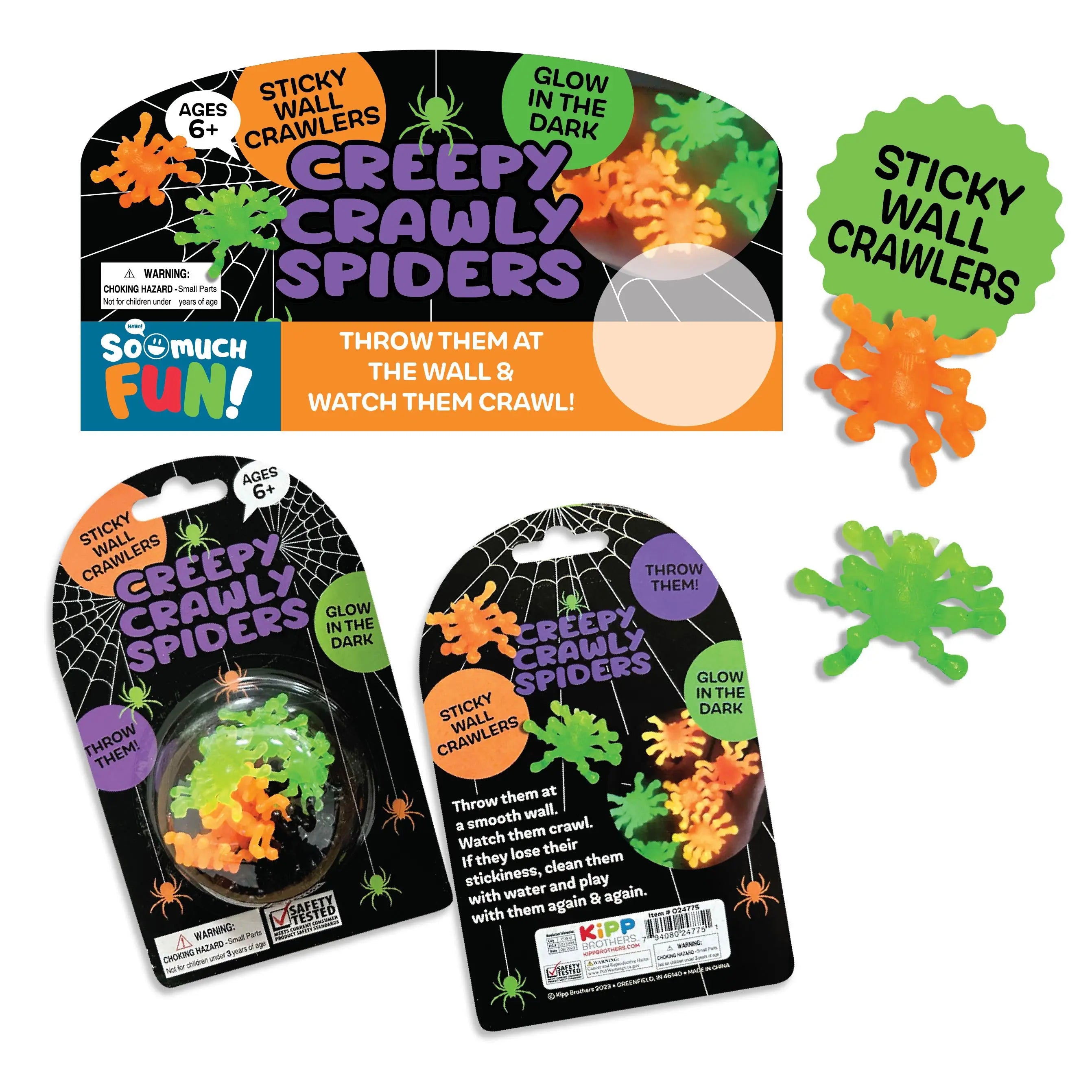 STICKY WALL CRAWLERS! GLOW-IN-THE-DARK! Throw them at a smooth wall. Watch them crawl. If they lose their stickiness, clean them with water and play with them again & again. 12 blister cards in inner box with toy bin card included for use on the So Much FUN! Toy Bin Program corrugated display or in the clear toy bin pockets. Product fits short or tall bins.