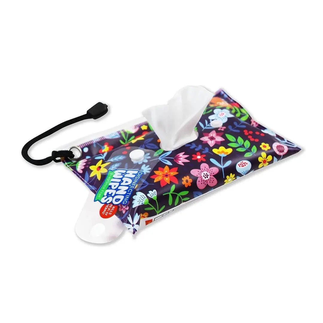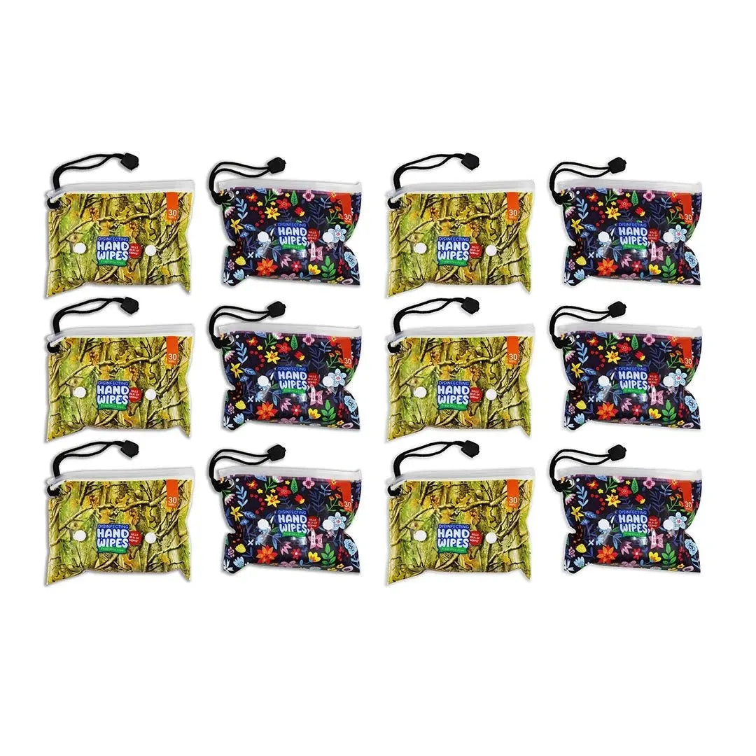 Disinfecting Hand Wipes 30 count dispenser. Keep clean hands within reach! 75% Alcohol. Kills 99.9% of germs. Suitable for wiping hands, face and skin. Convenient, plastic dispensing pouch. Full print pouch with snapping handle. 6 each of 2 designs per display.