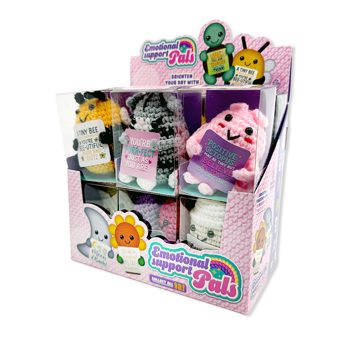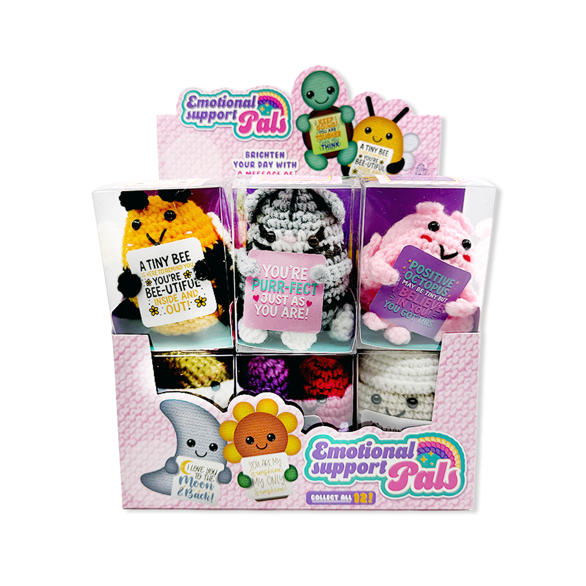 Find comfort and companionship with our Emotional Support Crochet Plush Pals. Each handmade treasure features a unique stitched phrase to bring a smile to your face. With a variety of styles in each retail ready display, you can collect them all and have a supportive friend for any mood.