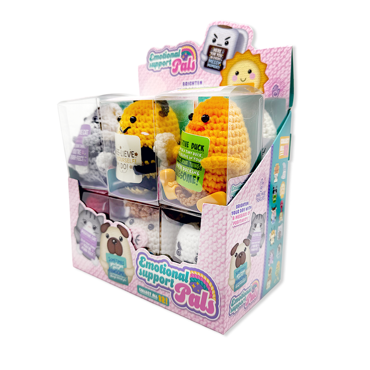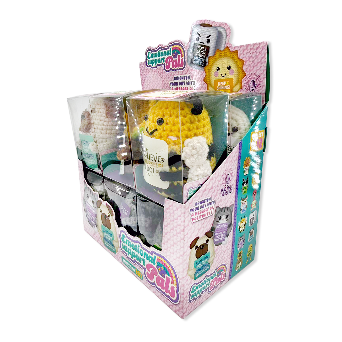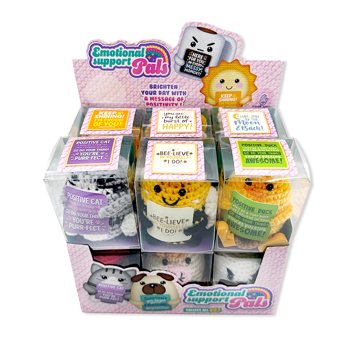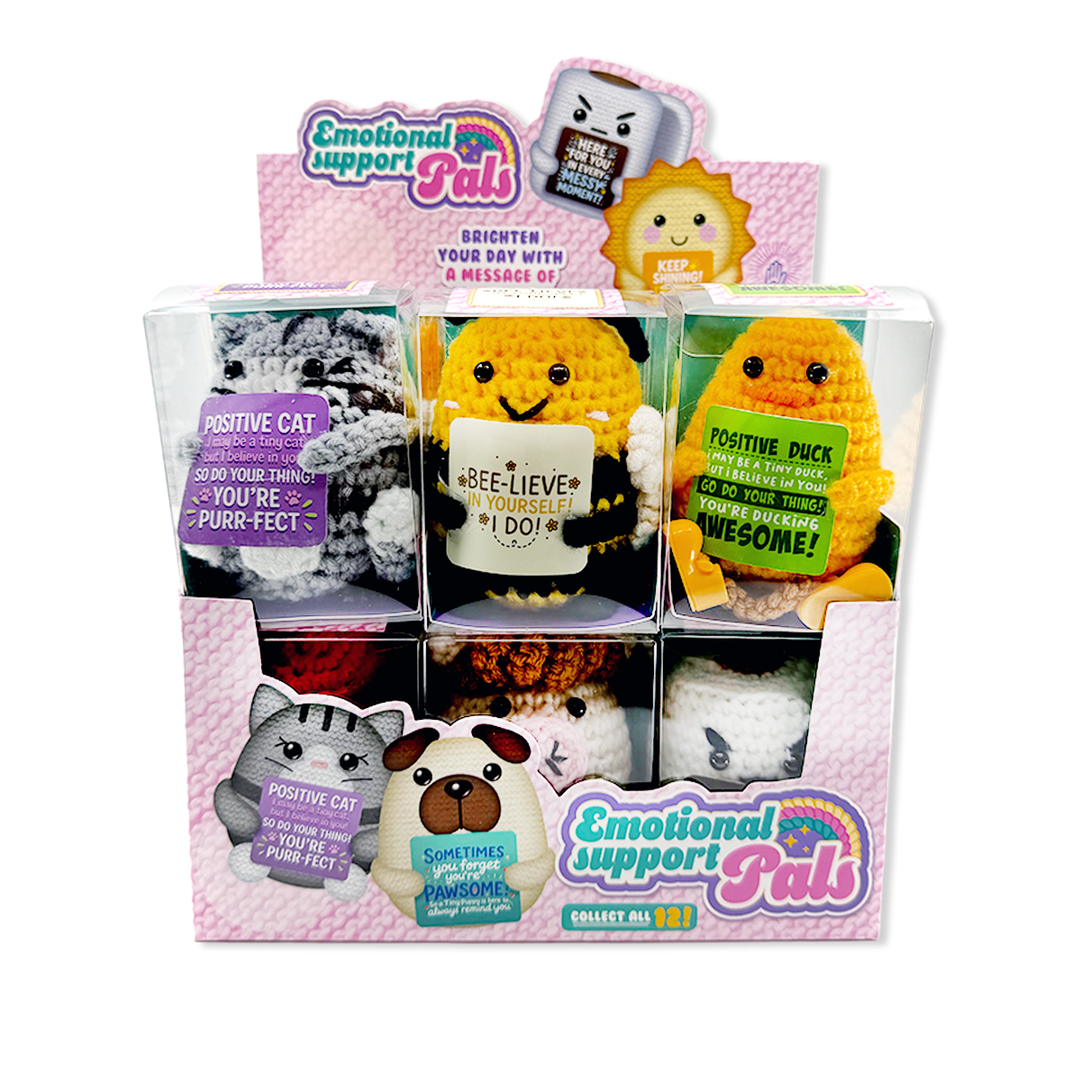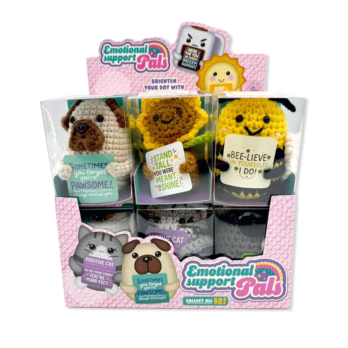 Find comfort and companionship with our Emotional Support Crochet Plush Pals. Each handmade treasure features a unique stitched phrase to bring a smile to your face. With a variety of styles in each retail ready display, you can collect them all and have a supportive friend for any mood.