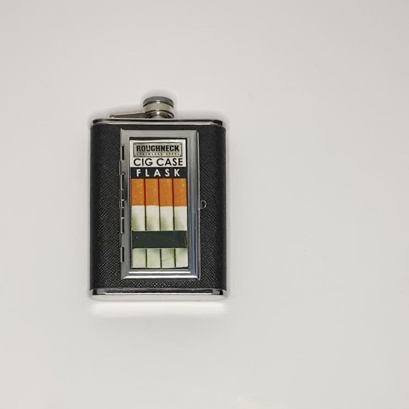 Compact and lightweight 8oz Flask made with food grade stainless steel and a soft PU leather covering with built in cigarette case. Holds 6 100's Cigarettes.