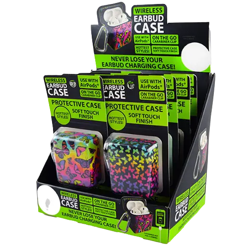 Wireless Earbud Case featuring on-the-go carabiner clip. Never lose your earbud charging case! Soft touch finish protective case for your AirPods®. Each display contains a design mix of the hottest styles!