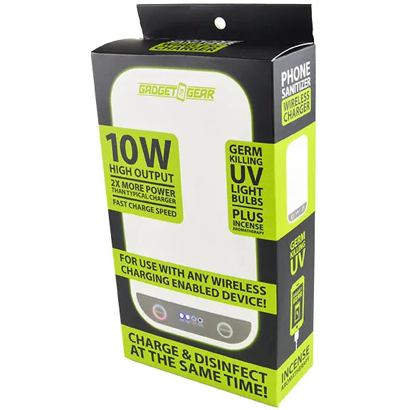 The Sanitizer cell charger works with any wireless charging enabled device! With a 10w high output, it's two times more power than a typical charger. And with it's high speed charging rate, you'll be back on your device in no time! Also sanitizes while charging by using germ-killing UV light bulbs, plus incense.
