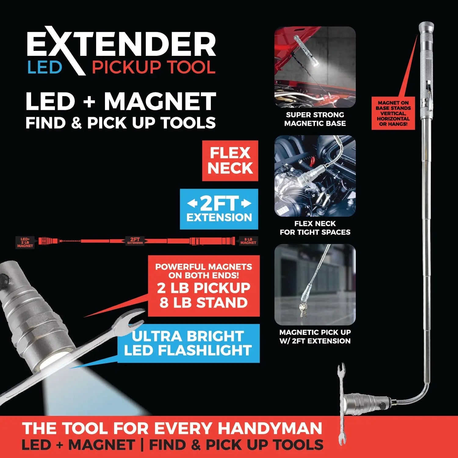Multi tool great for any need. Includes ultra bright LED flashlight and laser pointer, 2lb magnet and extendable head to pick up dropped metallic items. Can extend up to 2 ft.