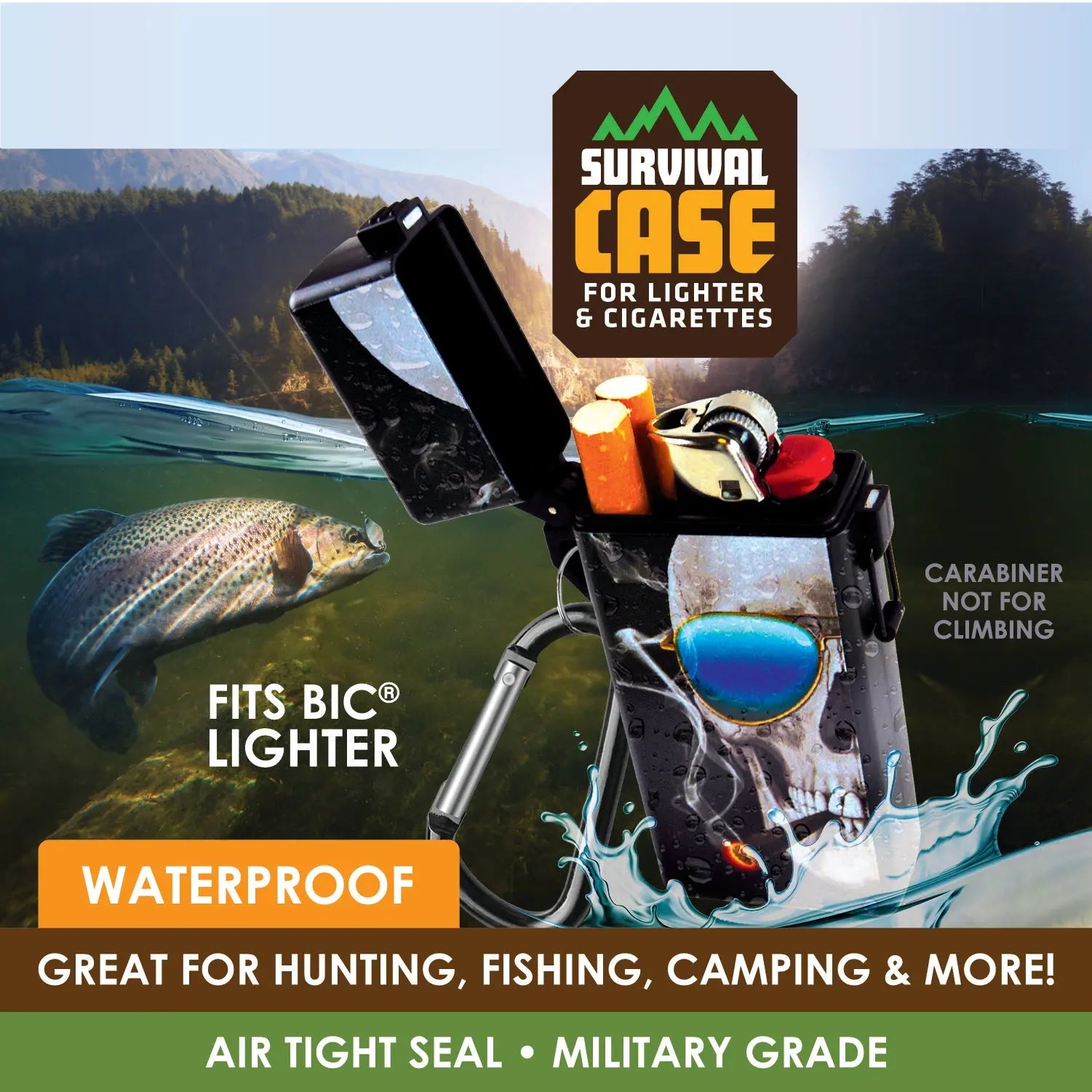 Our Survival Cigarette & Lighter Case is waterproof and military-grade for any adventure you'd like to tackle. Magnetic closure and air-tight seal keeps your cigs and Bic or similarly shaped lighter dry. Perfect for fishing, hunting, camping, and more! Comes in a variety of designs.