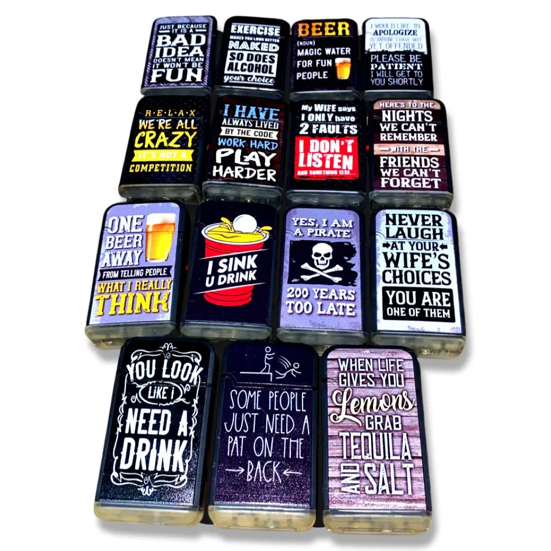 🍻🔥🥂 Dual Turbo Torch has 2300° flames, strong enough for any task! Great for camping, bronzing metal, soldering wires, flaming food, and more! Comes in various printed phrase styles, all featuring a closing lid.