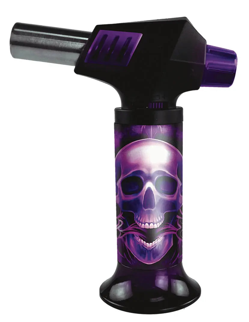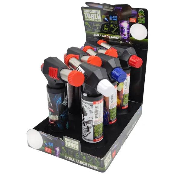 Printed Magnum Torch lighter has a 2300° flame, strong enough for any task! Great for camping, bronzing metal, soldering wires, flaming food, and more! Works at any angle, even upside down! Comes with a built-in safety lock. Large tank means plenty of fuel and an extra large flame makes any job easy. Refillable. Each display includes a variety of printed artwork styles.