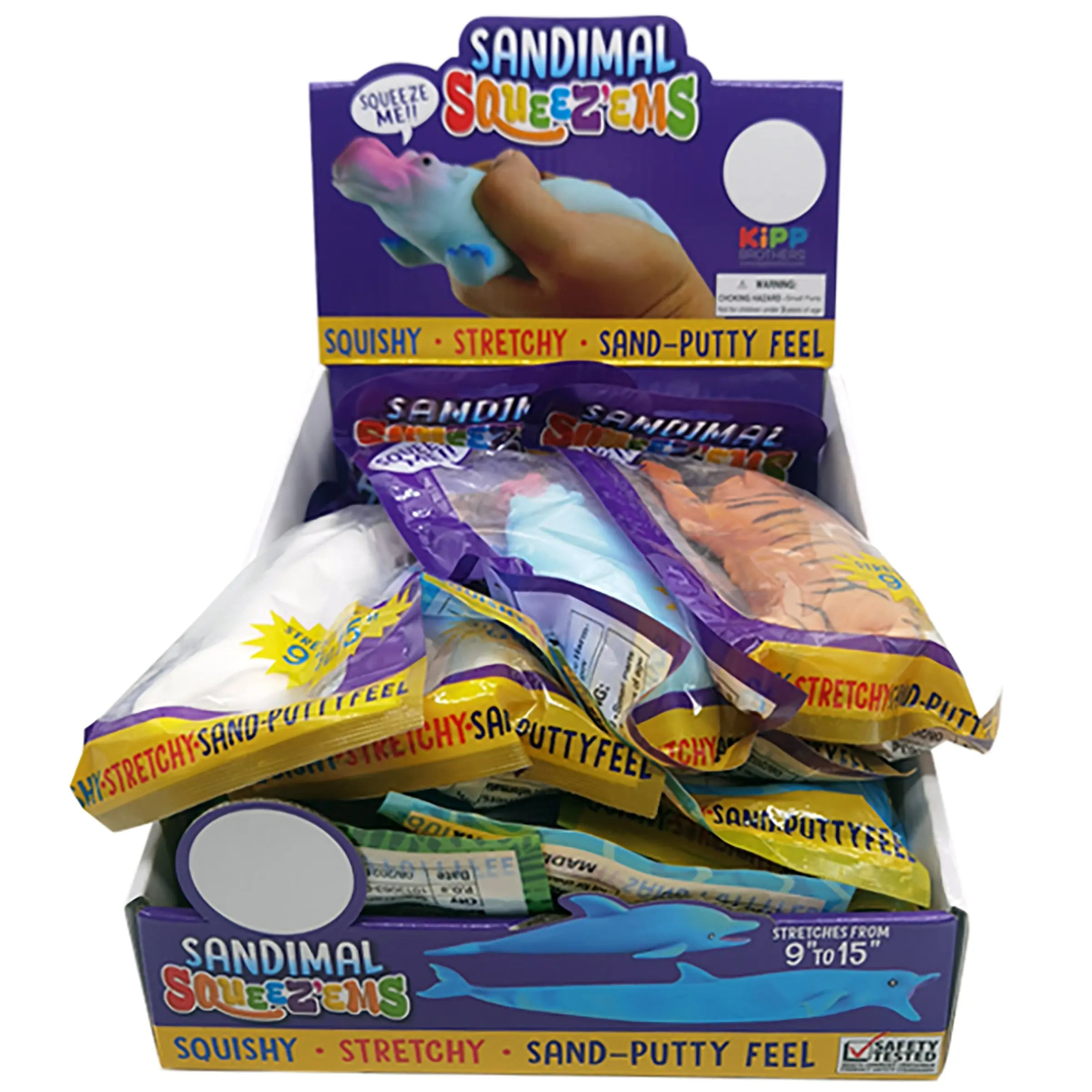 LARGE Sandimal Squeez'ems are stretchy, squishy, and adorable! Get the feel of playing with sand-putty, but without the mess! Comes in several cute animal designs. For children ages three and up. Safety tested, meets current consumer product safety standards.