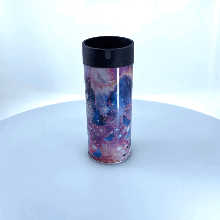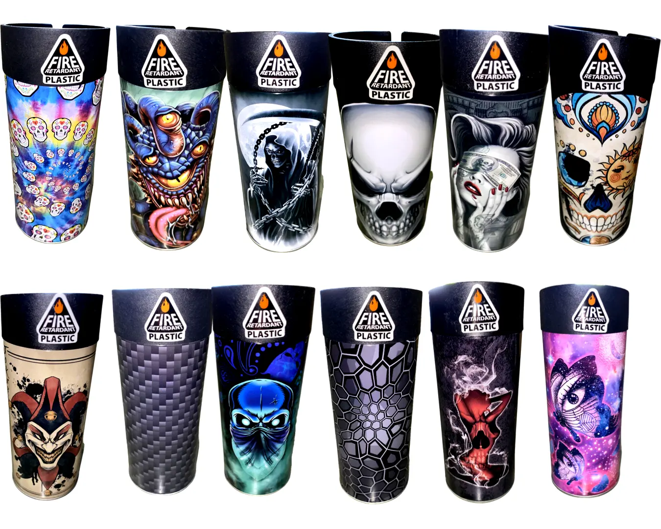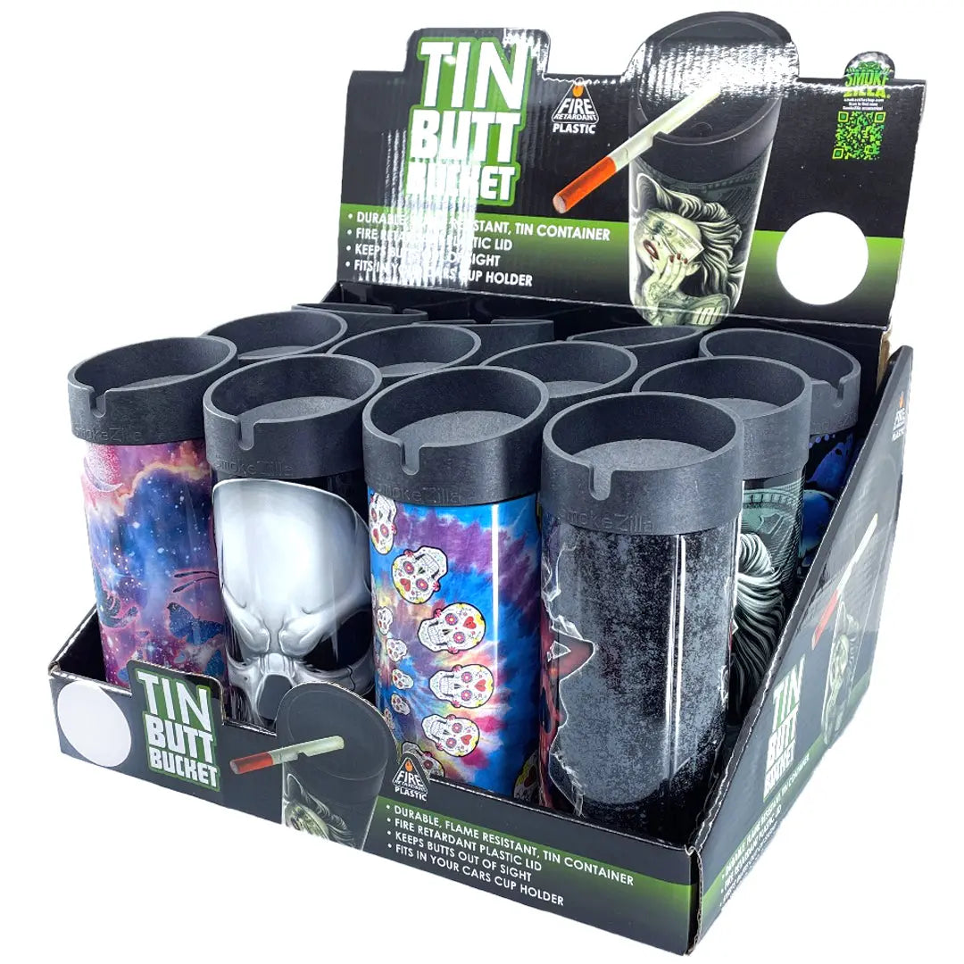 Keep butts out of sight with these durable flame resistant Cigarette Tin Butt Buckets. Fits right in cars cup holder. Comes in assorted printed designs.
