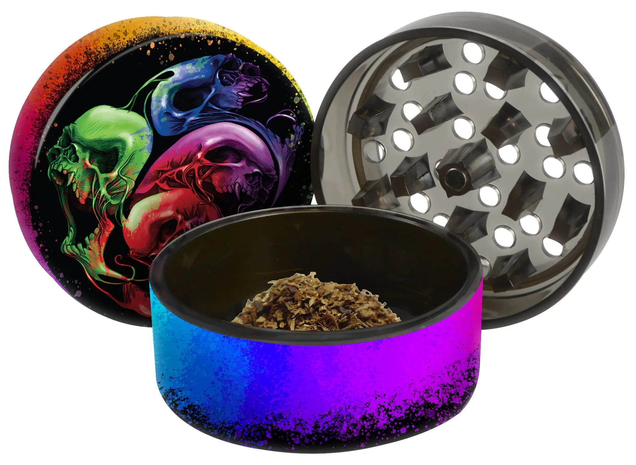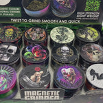 These durable metal/plastic grinders feature magnetic closure and 3 piece construction. Each grinder comes with a free scraper tool. It has a metal lid and bottom and the middle is plastic. Display includes an assortment of printed designs.