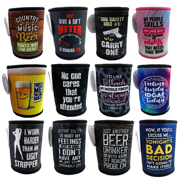 Highest quality on the market! Premium Insulated Neoprene Can Coolers keep drinks cold! 5mm THICK quality neoprene for top tier insulation. Featuring non-skid rubber bottom. Reinforced seams, top & bottom stitched. Each piece features trendy satirical designs.