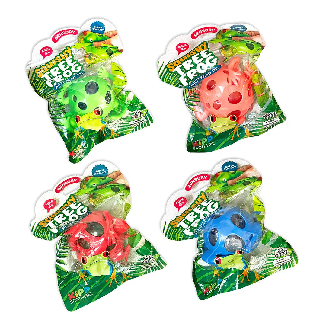 Squishy Tree Frog Ball filled with water beads. Four assorted colors are fun to squish. 12 individually bagged balls in inner box with toy bin card included for use on the So Much FUN! Toy Bin Program corrugated display or in the clear toy bin pockets. Product fits tall bins.