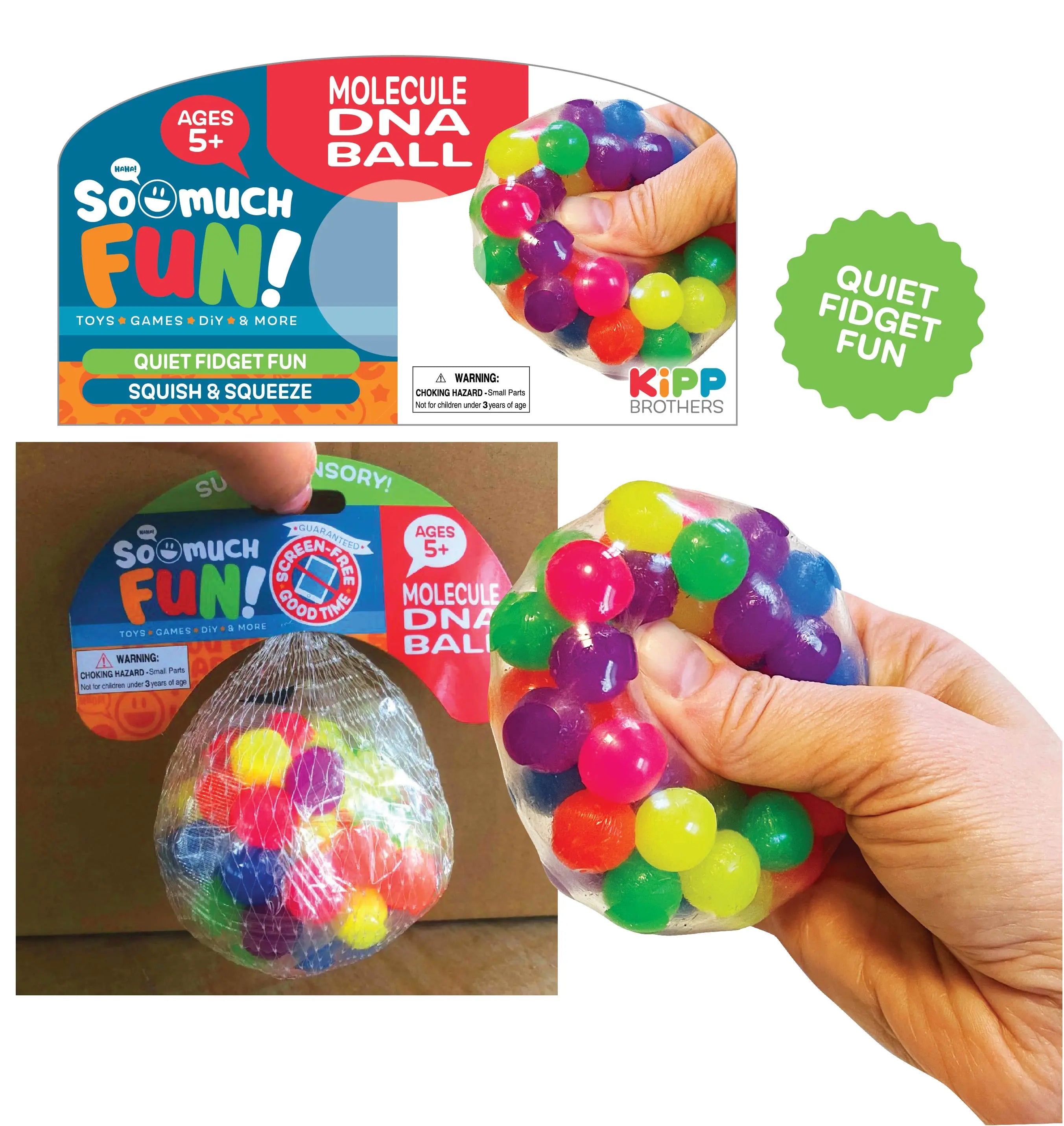 Sensory squishy ball filled with 50 inner soft marble sized balls that squeeze, squish. and slide around. Quiet fidget fun. Balls are individually packaged with a mesh bag and header card. 12 balls per inner box with toy bin card included for use on the So Much FUN! Toy Bin Program corrugated display or in the clear toy bin pockets. Product fits short or tall bins.