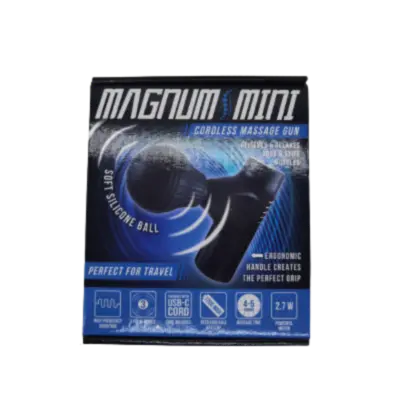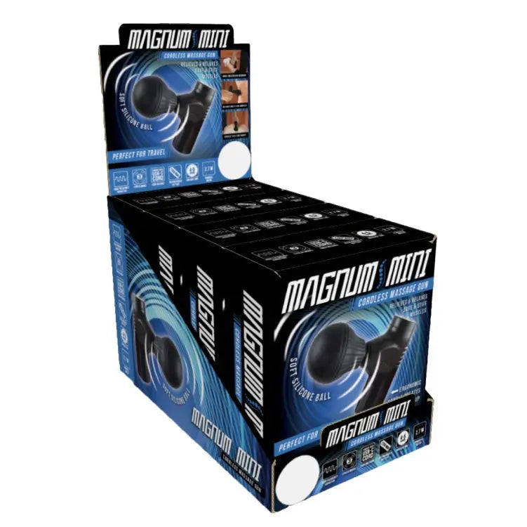 Magnum Mini Therapy CORDLESS Massaging Gun features 1200MAh rechargeable battery, 3 levels of pulsing action, 2.7W brush motor and a sleek soft-touch-finish design. THE IDEAL travel accessory and gift! Each display includes accessories shown. Relieves sore & stiff muscles with 4-5 hours of massage time! Great for athletes, business trips, at your desk and at home! Makes the perfect anytime present.