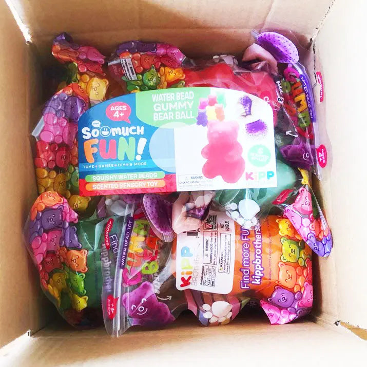 This 12-piece pack features exclusive scented gummy bear water bead balls. The squishy beads are available in six assorted scents, making them enjoyable to both touch and smell. Perfect for sensory play and relaxation. 12 individually bagged bears in inner box with toy bin card included for use on the So Much FUN! Toy Bin Program corrugated display or in the clear toy bin pockets. Product fits tall bins. NOT REAL FOOD – DO NOT EAT.