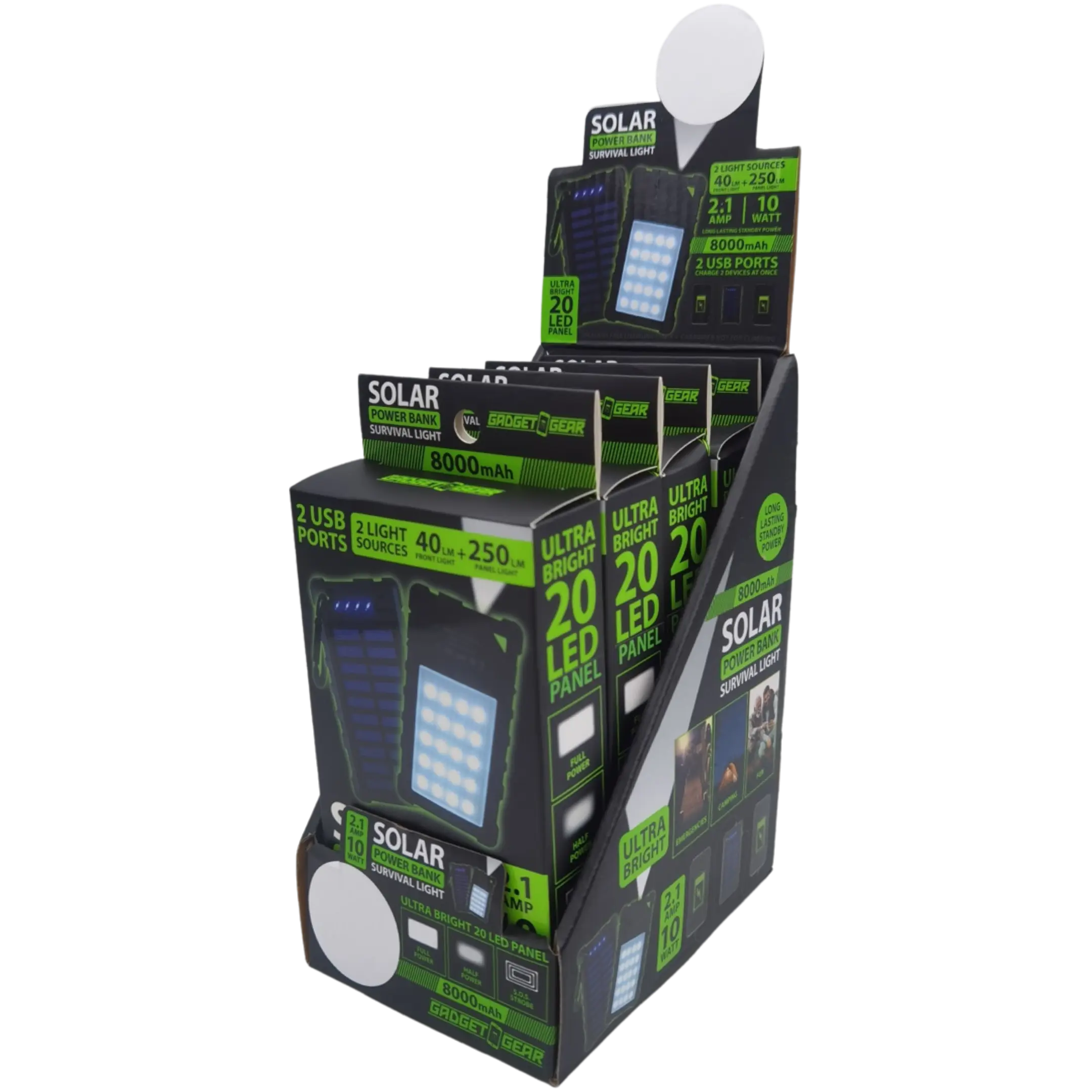 Gadget Gear Solar Power Bank Survival Light. Two(2) light sources! 40-Lumen front light and 250-Lumen panel light. Long lasting standby power. Ultra bright 20 LED panel. Includes carabiner(not for climbing) and charging cable. 2.1-Amp / 10-Watt / 8000mAh long lasting standby power! Rapid charge two(2) devices at once! Three(3) Survival Mode LEDs: Full, Dim and S.O.S Strobe. Perfect for camping, emergencies, travel, fun and more!
