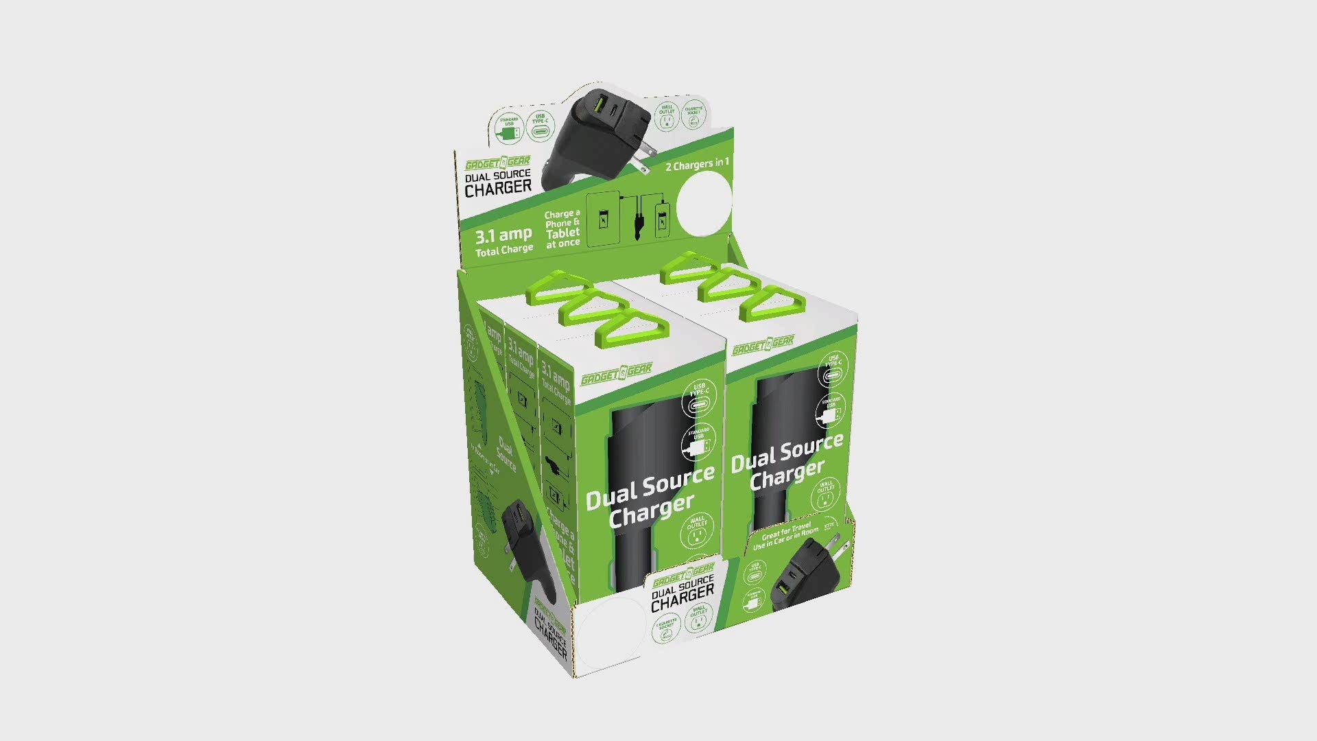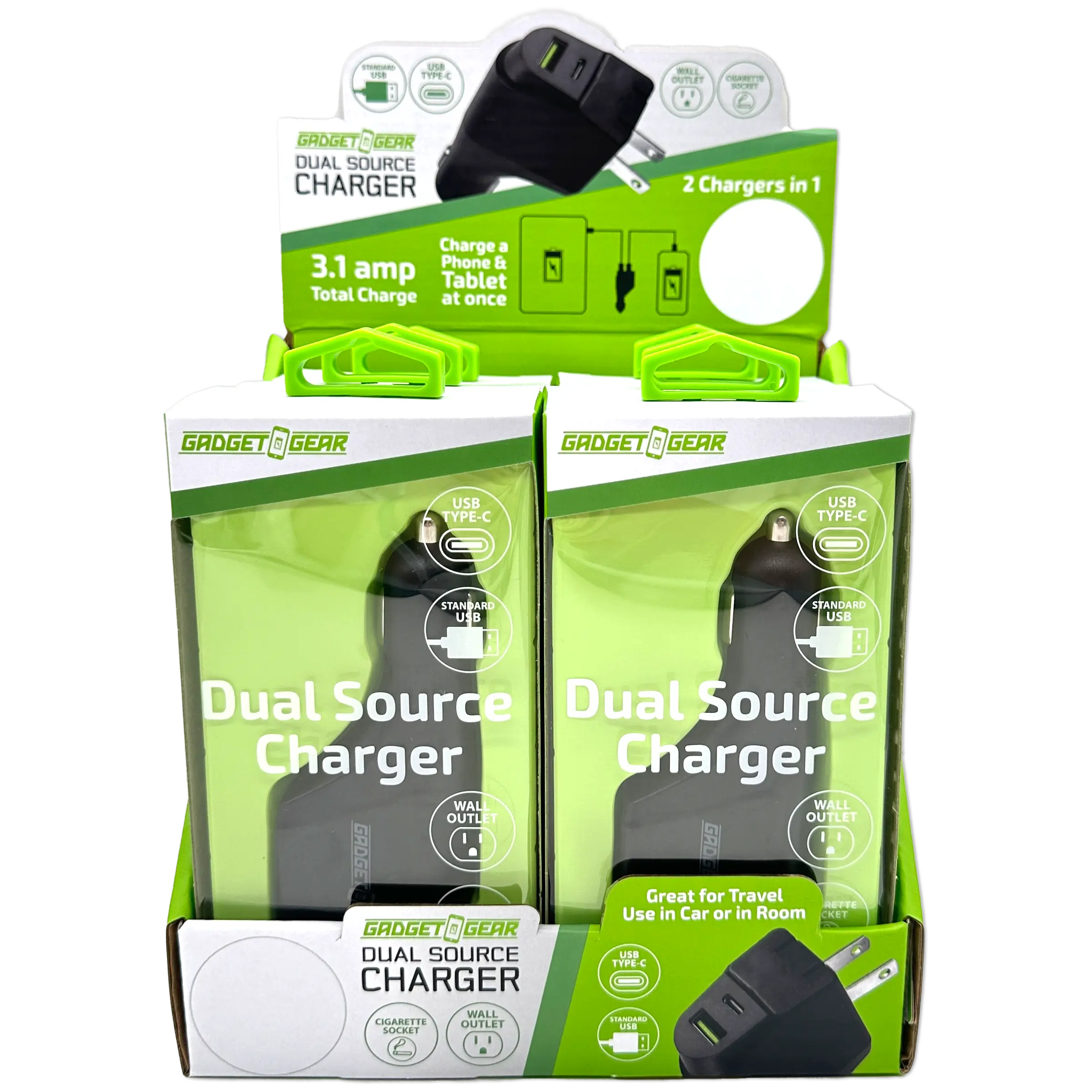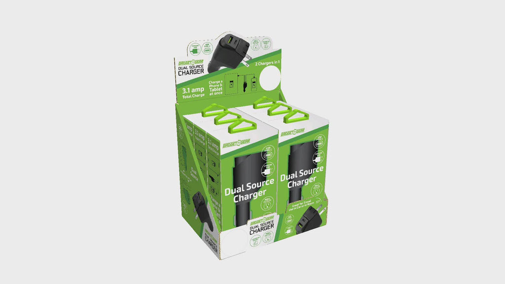 Dual Source Charger – great for travel! TWO CHARGERS in one. Features both a wall/socket(AC) and a car/cigarette(DC) adapter. 3.1A. Charge a phone and a tablet at the same time using the standard USB and USB-C ports. Socket plugs fold flat for compact storage. Charge Cables sold separately.