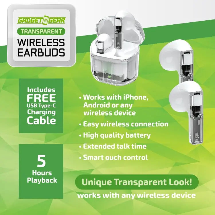 🎧 🎶 See your music in a whole new way with these TRANSPARENT Wireless Earbuds! Enjoy up to 3 hours of play time, plus a whopping 32 feet of range: your tunes will always be within reach. And with the included charging case and cable, your music can keep up with your wildest dance moves. Each display includes a mix of black, red and white color options. Ramp up the night and follow the beat!