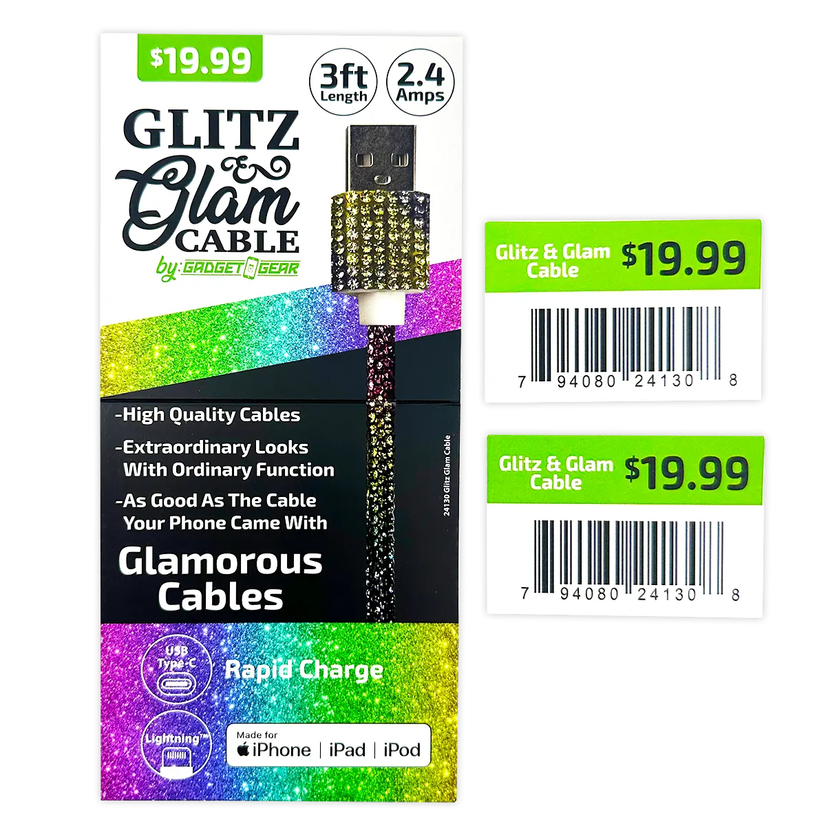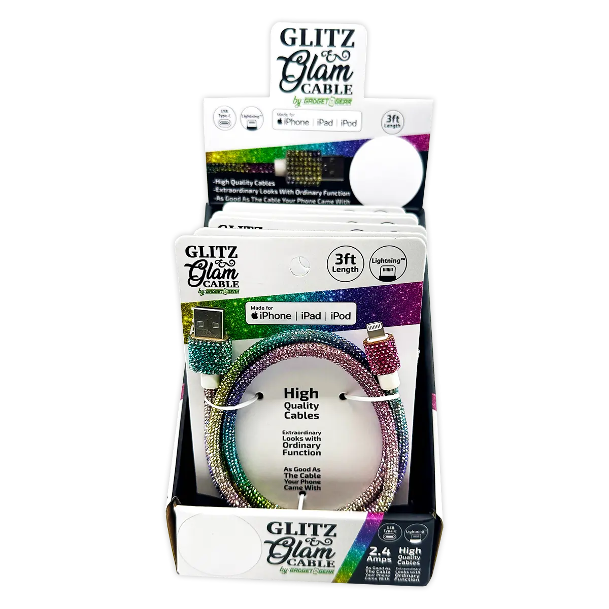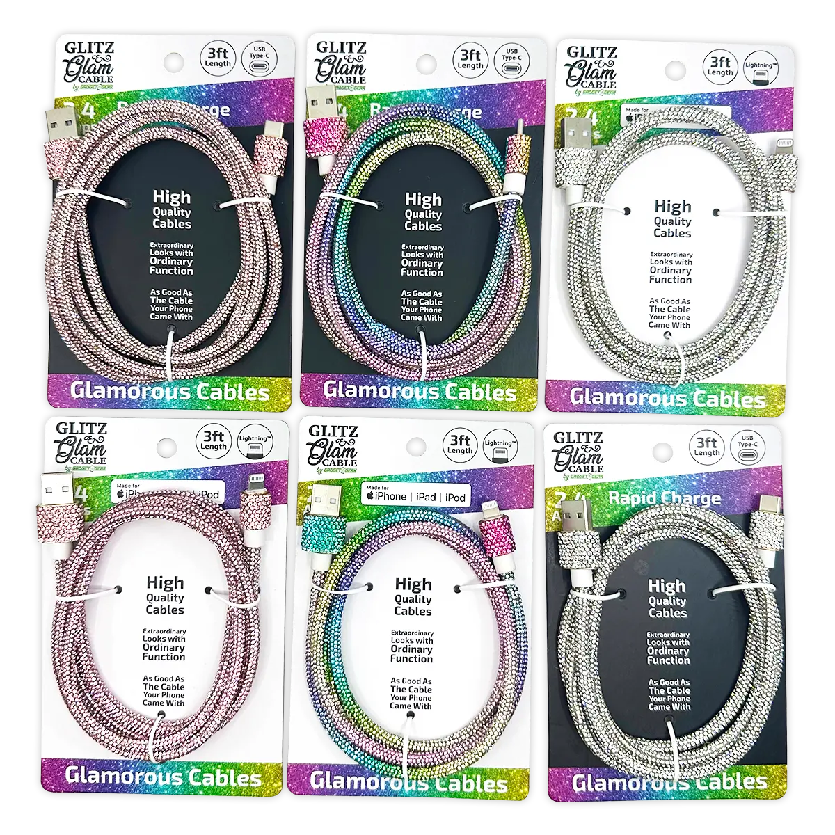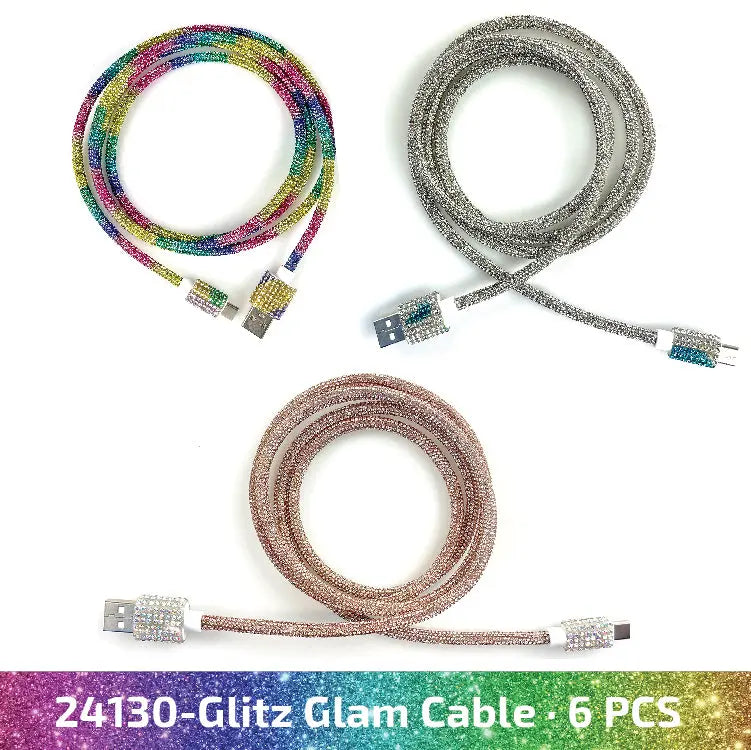 Charging Cable 3FT 2.4Amp Glitz N Glam Assortment - 6 Pieces Per Retail Ready Display 24130