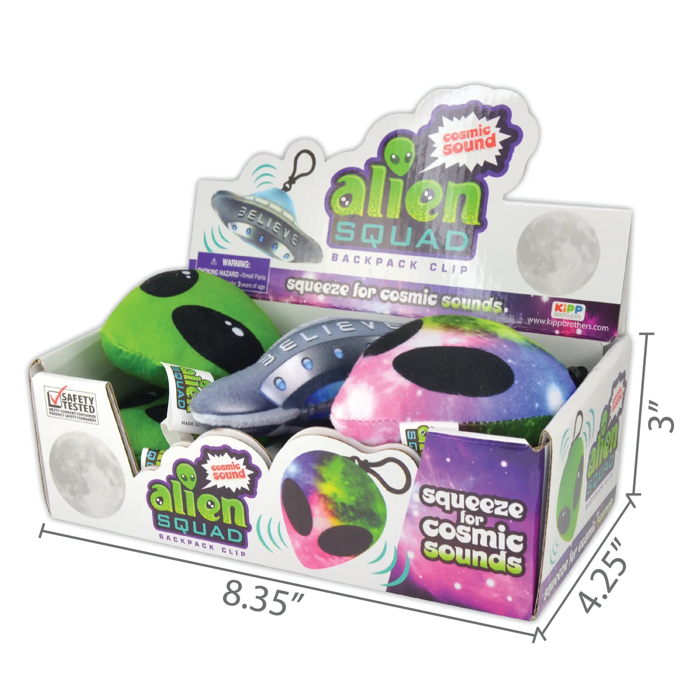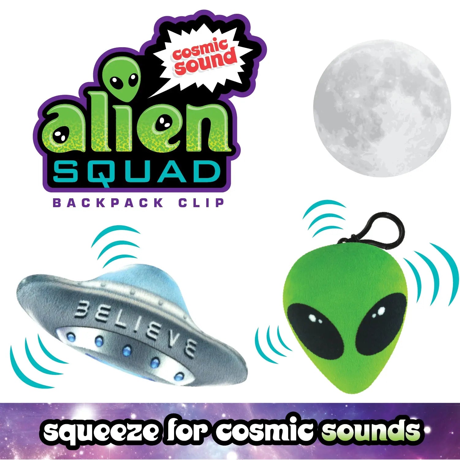 Soft Alien Squad bag clips makes fun cosmic sounds when squeezed. Comes in assorted different designs and colors.