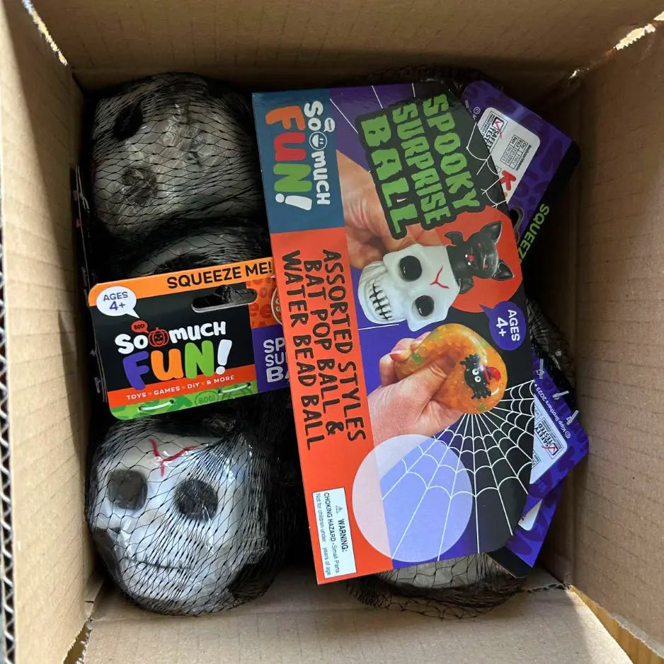 Spooky surprise balls, collect them all! Skull ball with pop up bat and water bead ball styles. Squeeze the skull and a cute little bat pops up. The water bead balls each have a figurine inside. Squish to find it. 12 mesh bags in inner box with toy bin card included for use on the So Much FUN! Toy Bin Program corrugated display or in the clear toy bin pockets. Product fits short or tall bins.
