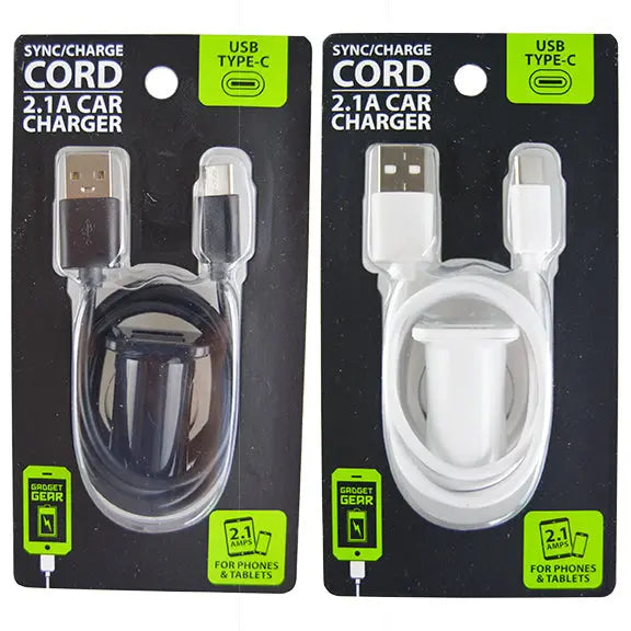 2-piece MFI 3ft type C Sync and Charging cord with 2.1A car charger. Works with iPods, iPhones, and iPads. Comes in black and white.