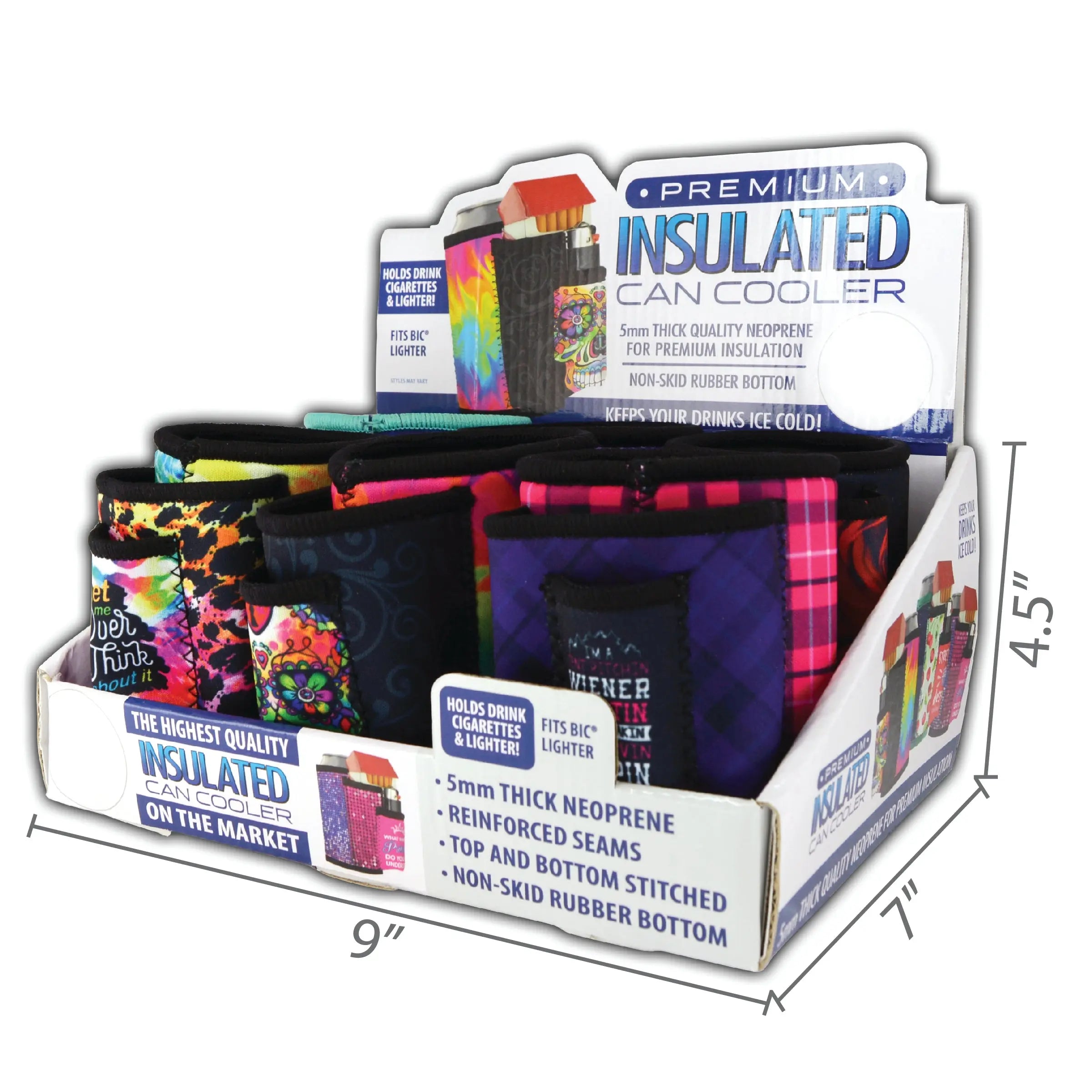 Premium insulated can coolers keep your drinks ice cold! 5mm THICK quality neoprene for premium insulation. Featuring non-skid rubber bottom. Each display includes a variety of artwork, and a pocket perfect for cigarettes, credit cards, license, lighter, etc. Fits BIC and similarly shaped lighters. Reinforced seams, top & bottom stitched. Highest quality on the market!