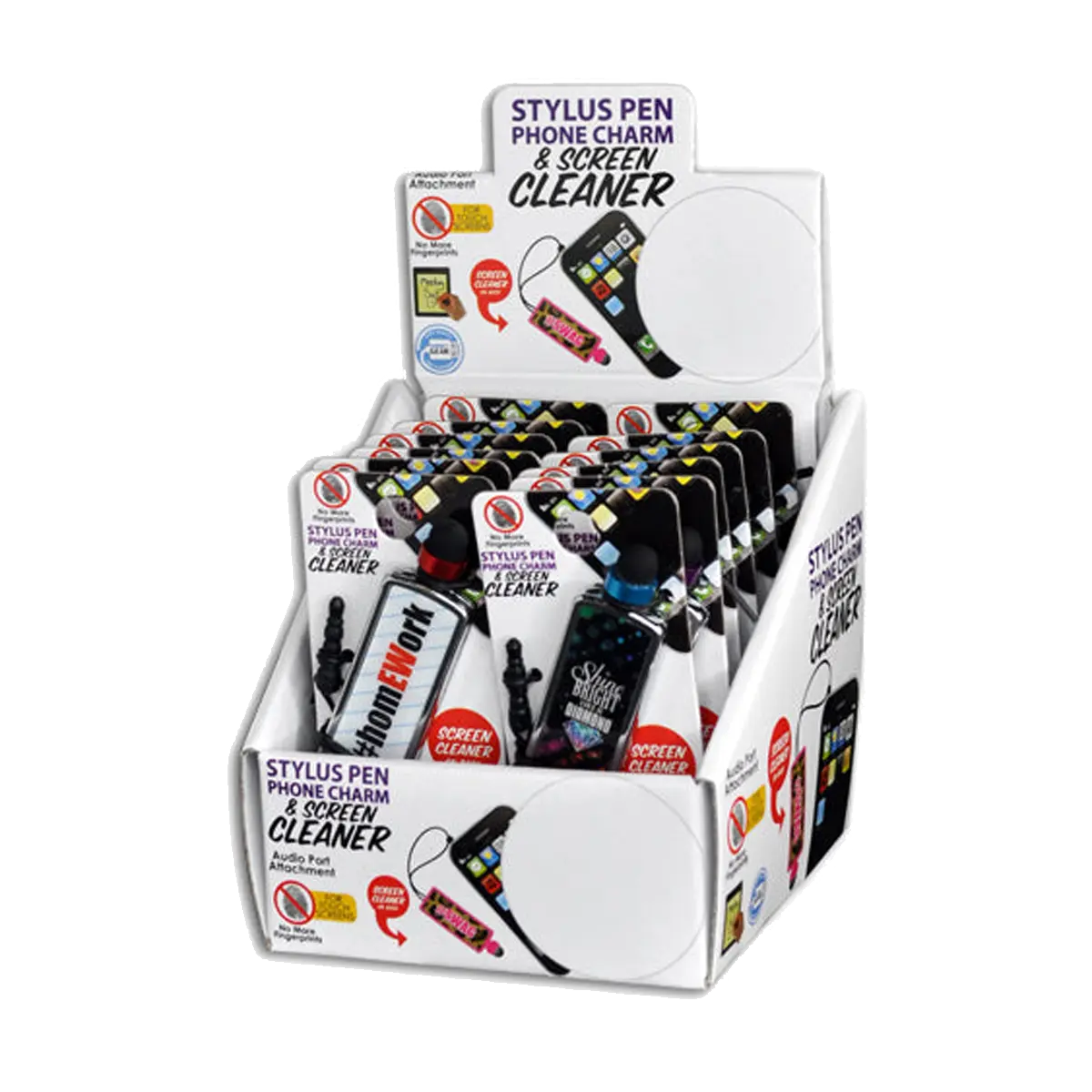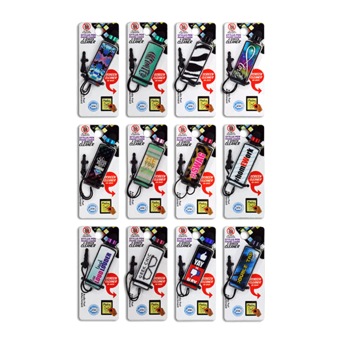 Stylus pen, phone charm and screen cleaner. Features audio port attachment. Assortment of phrase styles included.