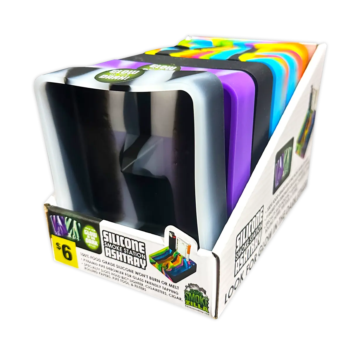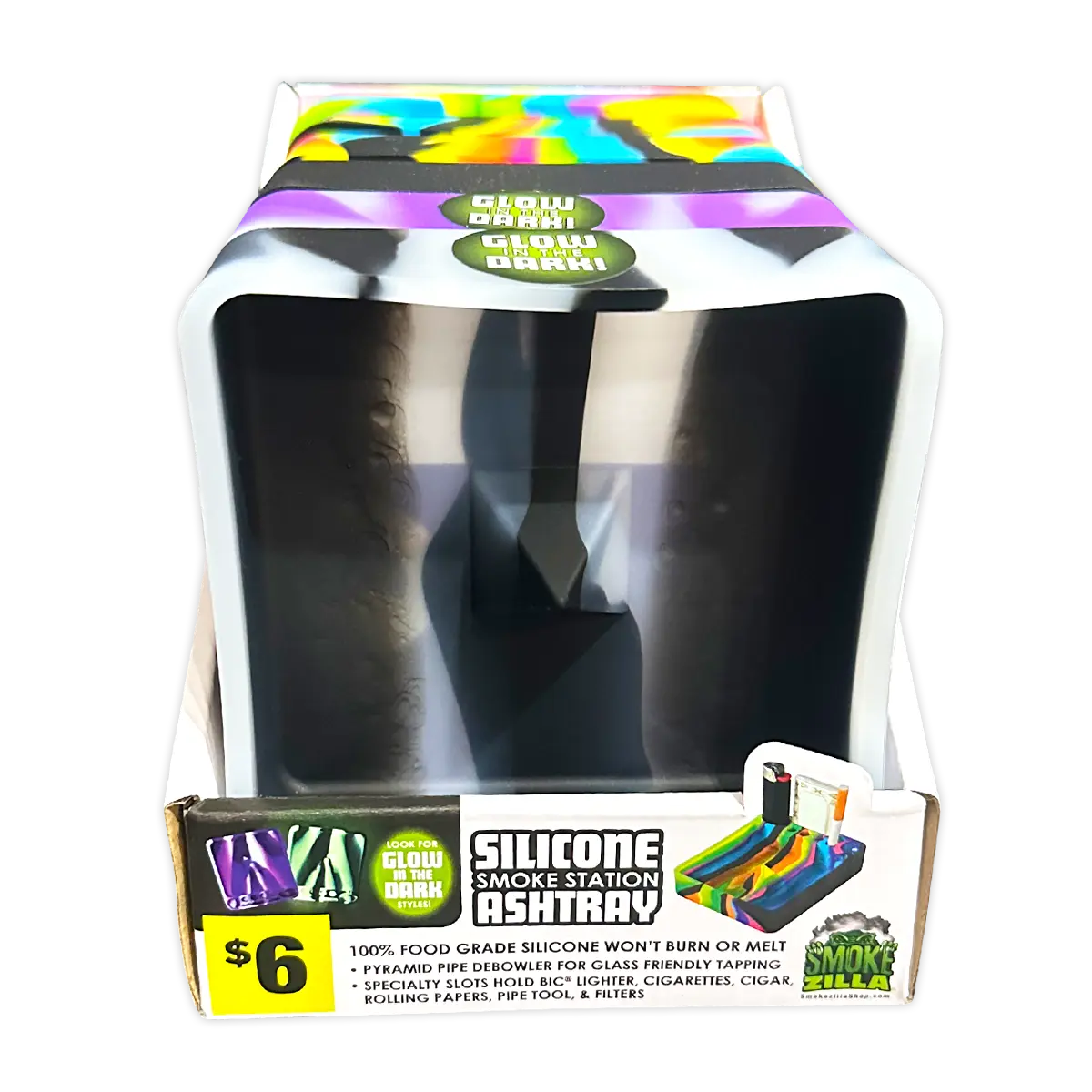 Ashtray made from 100% food grade silicone and will not melt or burn. Has built in pyramid pipe debowler for glass friendly tapping and specialty slots for lighter, cigarettes, cigar, rolling papers, pipe tool and filters. Assorted colors including surprise glow in the dark styles.