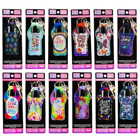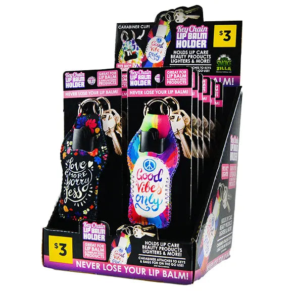 Keychain Lip Balm & Lighter Holder — never lose your lip balm or lighter again! Holds lip balm, BIC® lighter and more! Carabiner attaches to keys & bags for on the go use! Each display contains a variety of design styles.