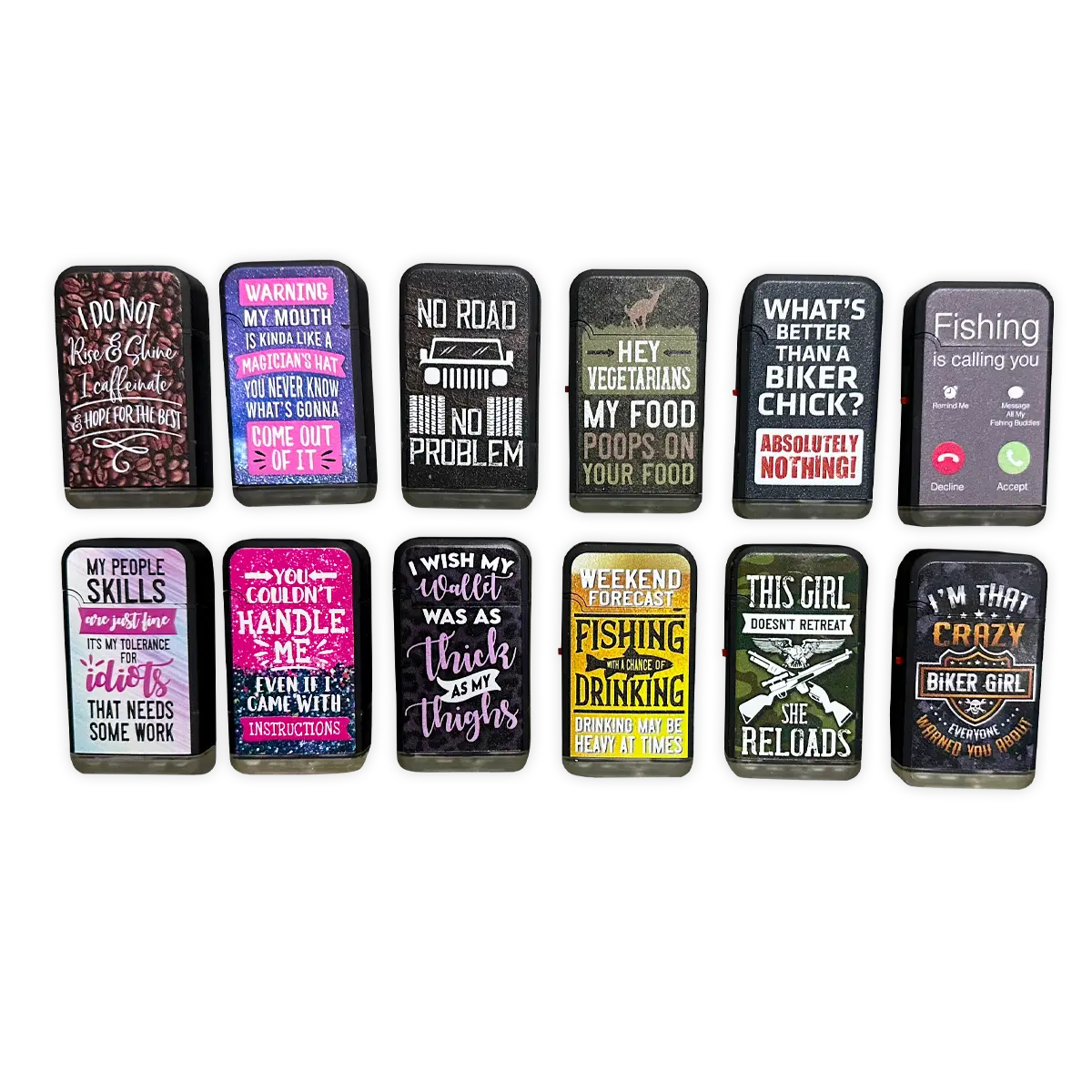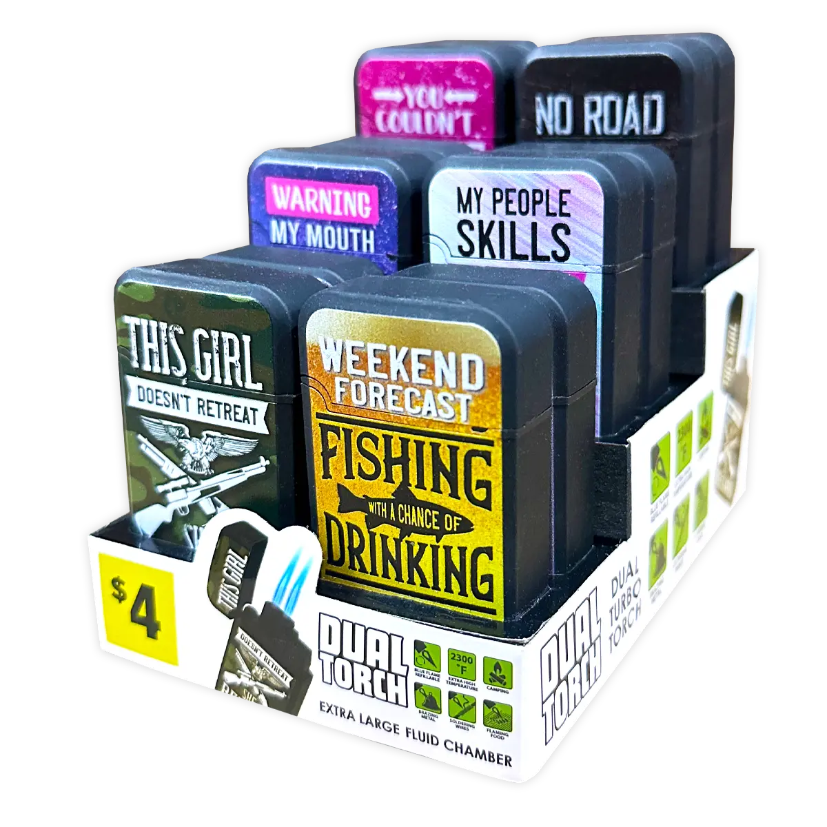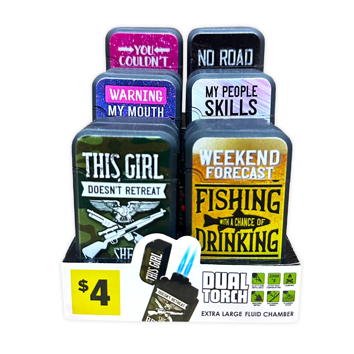 Big Bubba soft touch torch lighter with super cool sayings. Has a 2300° refillable blue flame and extra-large fluid chamber. Great for camping, brazing metal, soldering wires, and flaming food. Comes in assorted designs.