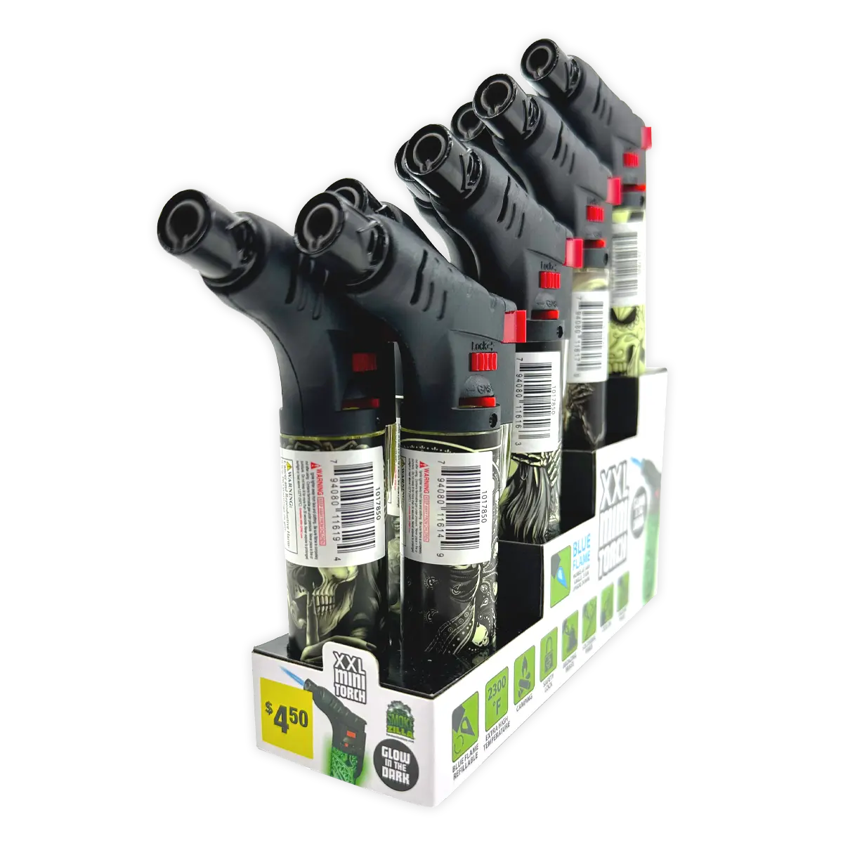 Refillable Glow in the Dark mini xxl flame torch. Has a safety lock and 2300° flame that works at any angle. Great for camping, bronzing brass, soldering wires, brazing food, and more! Comes in assorted glow in the dark designs.