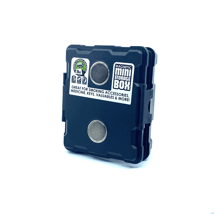 Super strong Mini Magnetic Storage Box fits cigarettes, lighters, cash, cards, spare keys, jewelry, valuables and more! Each box features two 20+lbs grade neodymium magnets on top. Powerful magnets easily attach to things in the home, outdoors, even your car! Features an airtight smell lock and weatherproof casing.