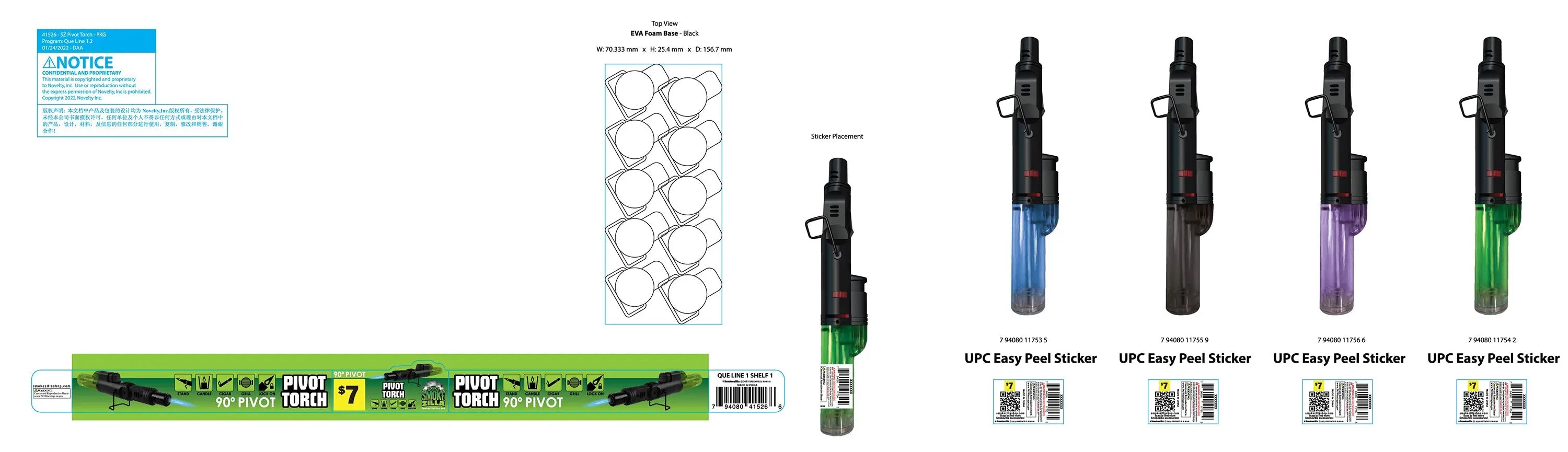 90º pivoting torch that works at any angle — even upside down! Small enough to fit in your pocket, yet powerful and versatile enough for any task; from lighting candles, grills, bonfires and more! Safety cap stops ignition when closed. Refillable butane tank. Each display includes a variety of transparent color styles.