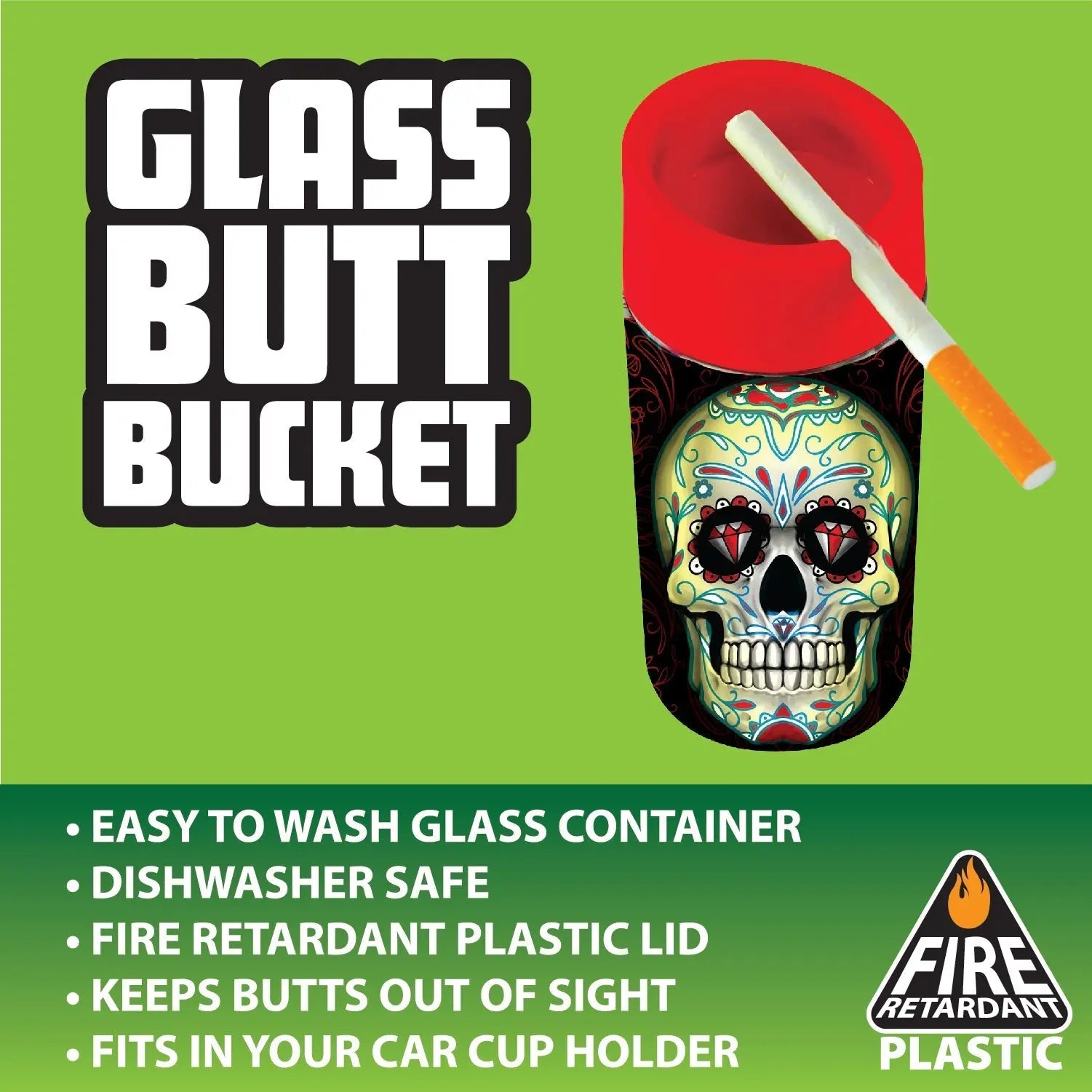 Gotta have these Glass Butt Buckets! Designed to keep your butts out of sight and reduce odor with its smell-smothering capsule that traps smoke and ashes. Fits in your car cup holder and has fire retardant lid. Dishwasher safe. Comes in assorted designs.