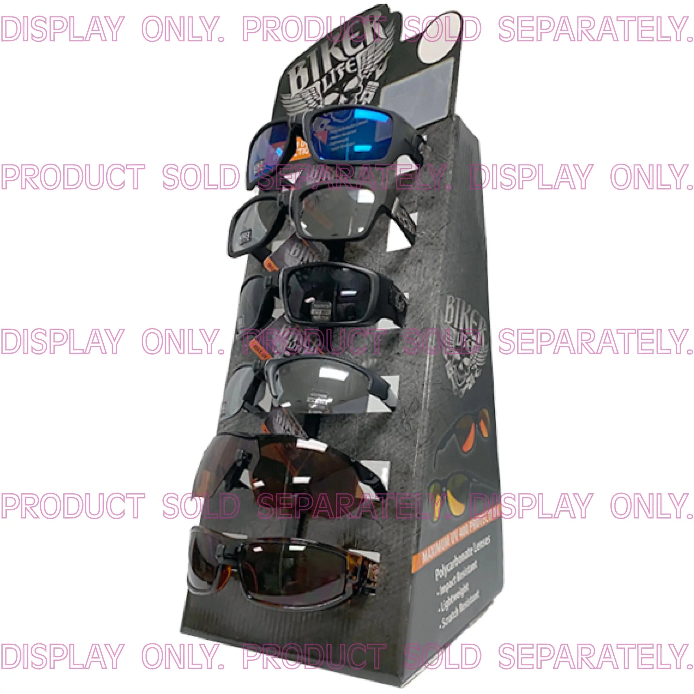 Corrugated Cardboard Display holds 6 sunglasses. Includes 6 nosepiece hooks for easy hanging.
