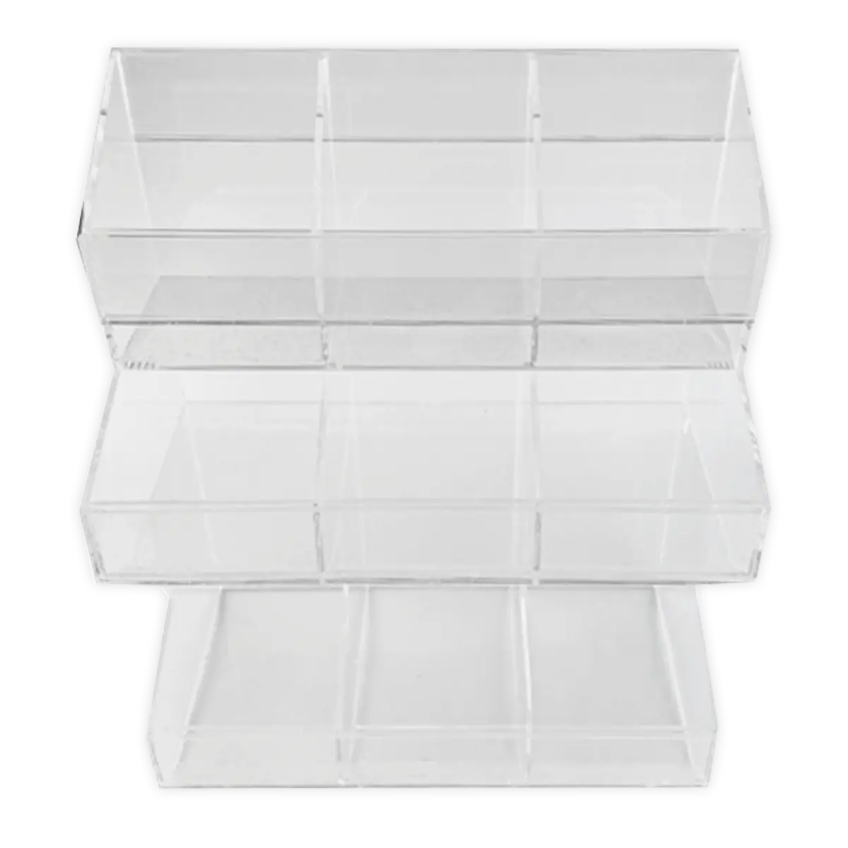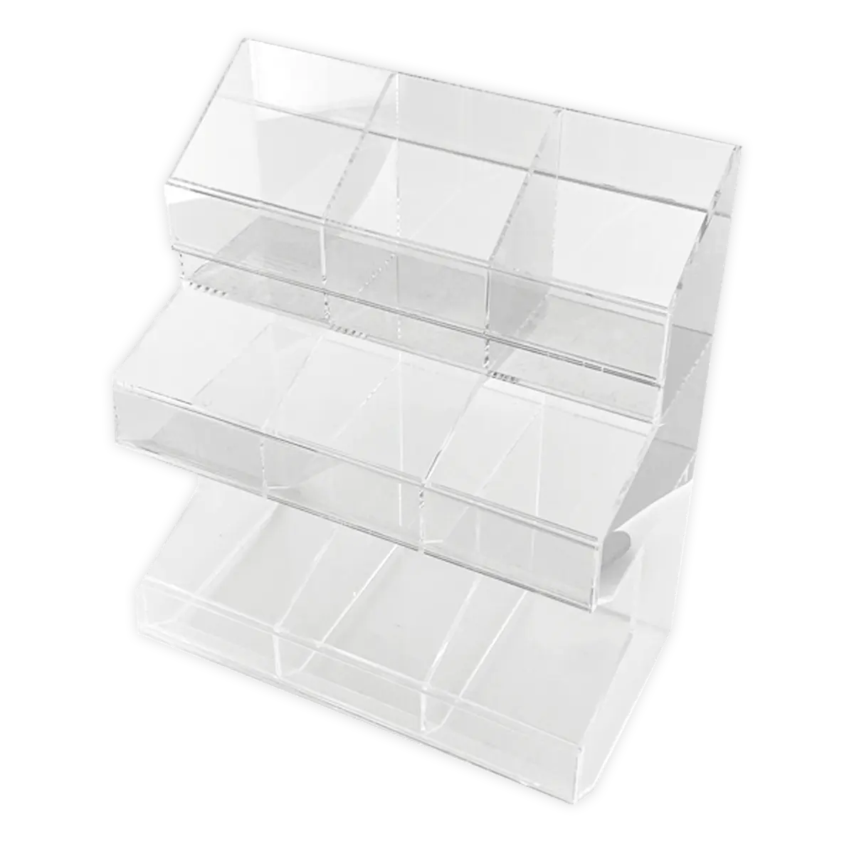 Nine Bin Bulk Acrylic displays a variety of products. Features signage slots.