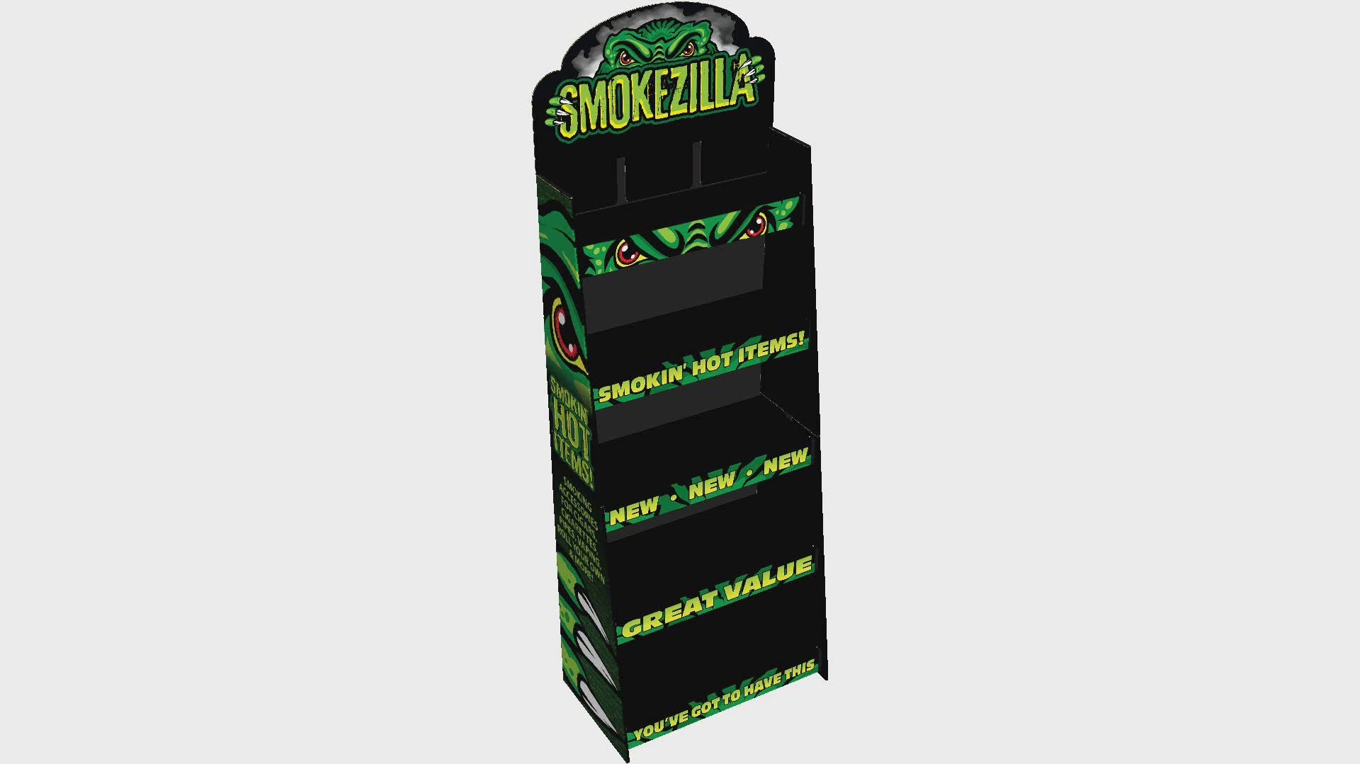 Our 2-foot Corrugated Smokezilla Floor Display highlights a variety of products across five shelves.