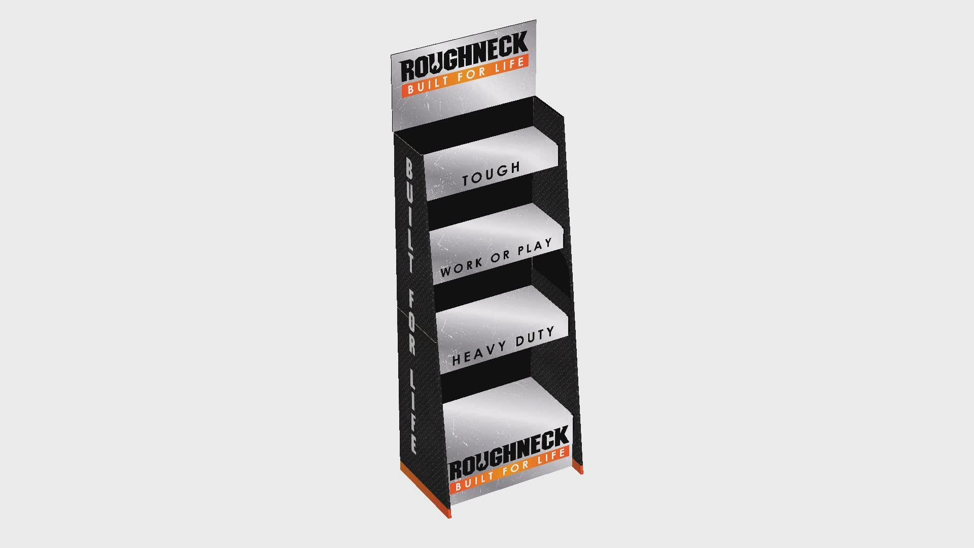 Our 20"W Corrugated ROUGHNECK Floor Display highlights a variety of products across four(4) shelves.
