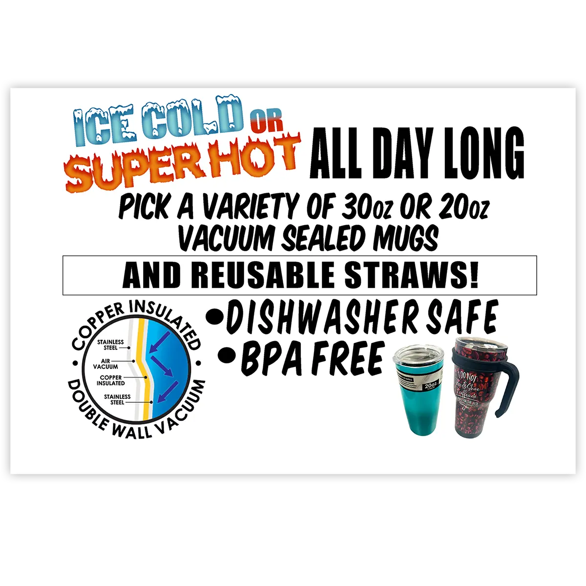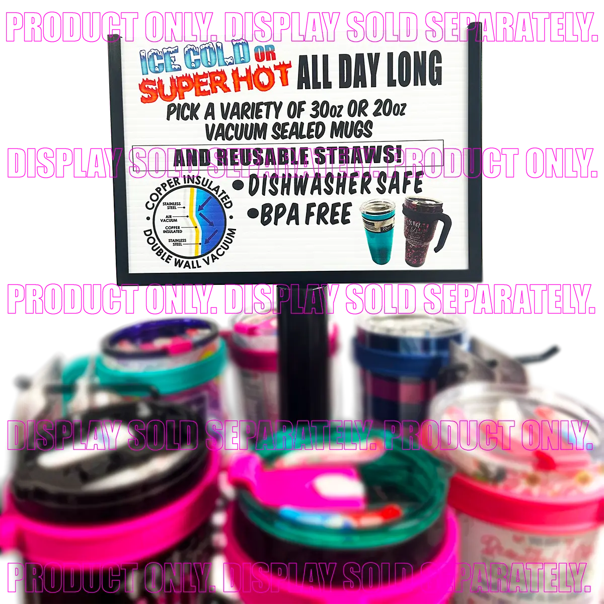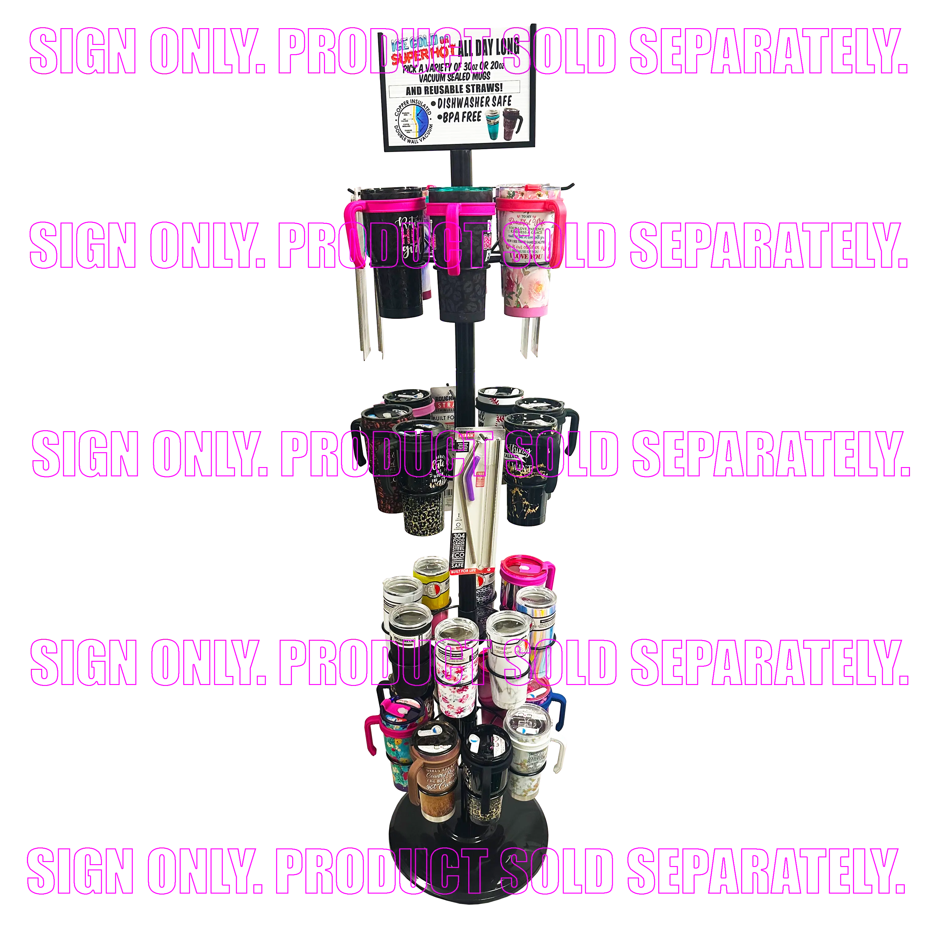 This Cup Spinner Merchandising Header is two-sided and perfect advertising for selling product! Fits perfectly in our spinner rack 976070. Floor Display sold separately.