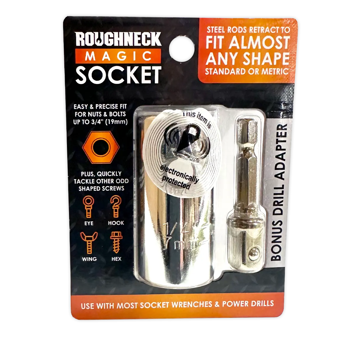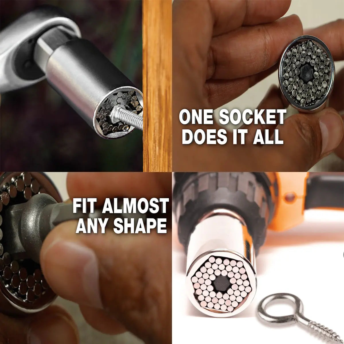 Experience the magic with our Magic Socket Tool! It easily and precisely fits nuts and bolts up to 3/4" (19mm) and can quickly tackle other odd-shaped screws like Hex, hook, eye, and wing. With retractable steel rods, this tool can form almost any shape, making it a must-have for any toolbox.