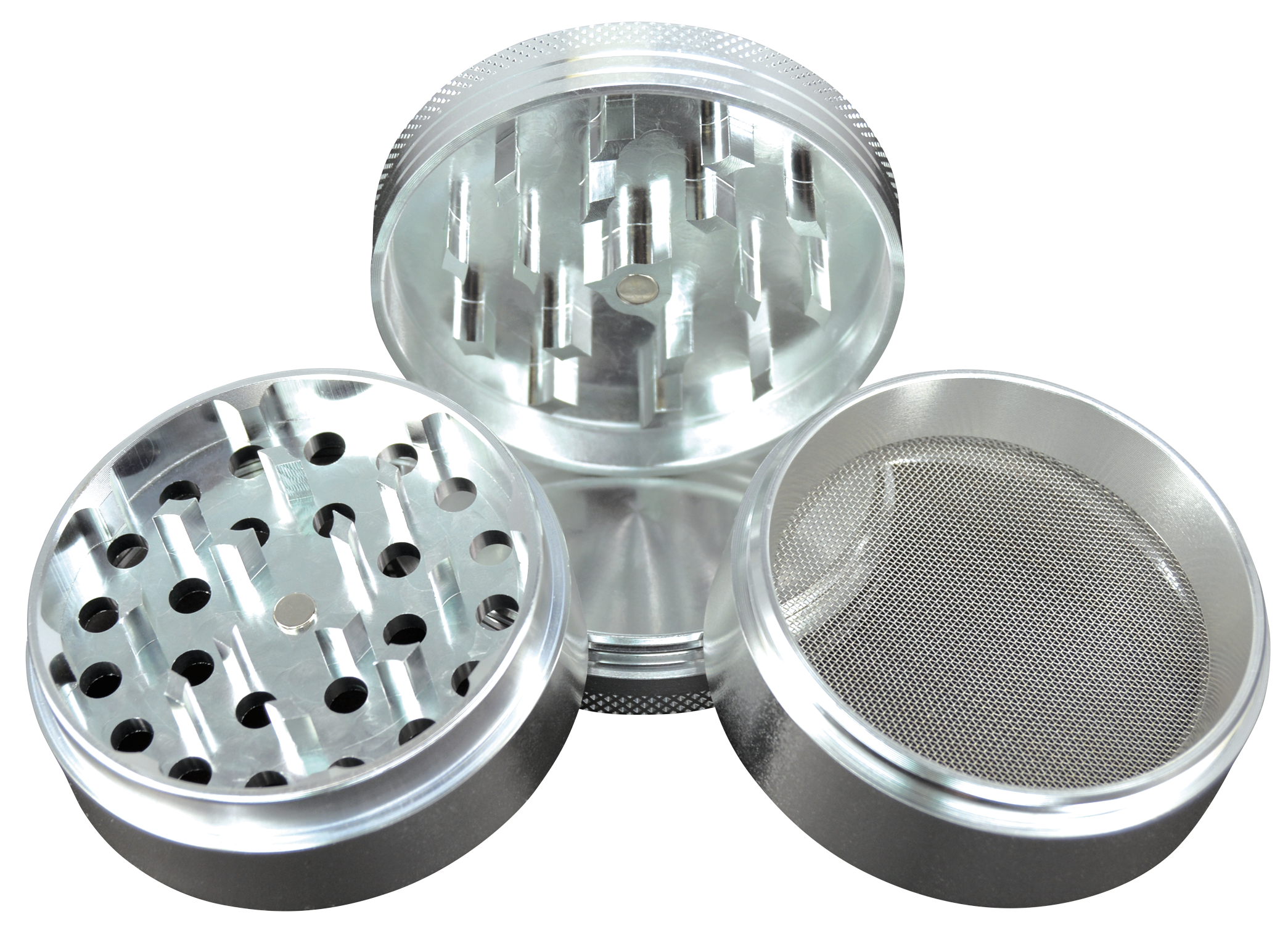 63 MM 4 piece grinder. Comes in a classic silver color. Made from durable, lightweight aircraft grade aluminum. Has fine metal screen and includes scraper tool. Assortment varies.