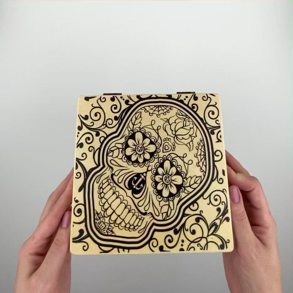 Wood treasure box for keeping items safe and secure. Made from durable pine material with metal latching lock. Includes removable tray. Assorted designs.