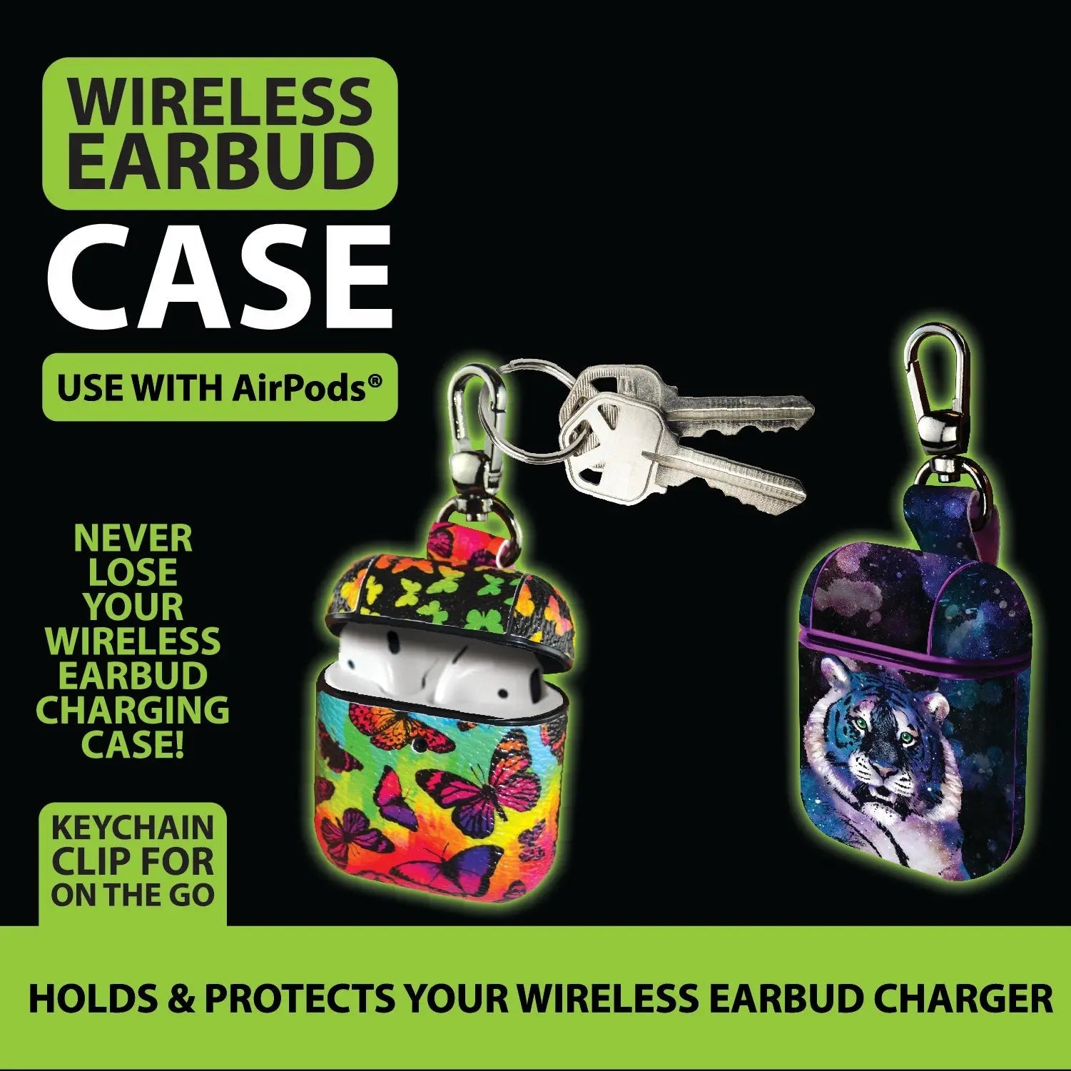 Printed Case for AirPods charger with clip so you can clip your AirPods right to your purse, belt loop and more. Charge your airpods right through the case wirelessly or with a charge cable. Comes in assorted designs.