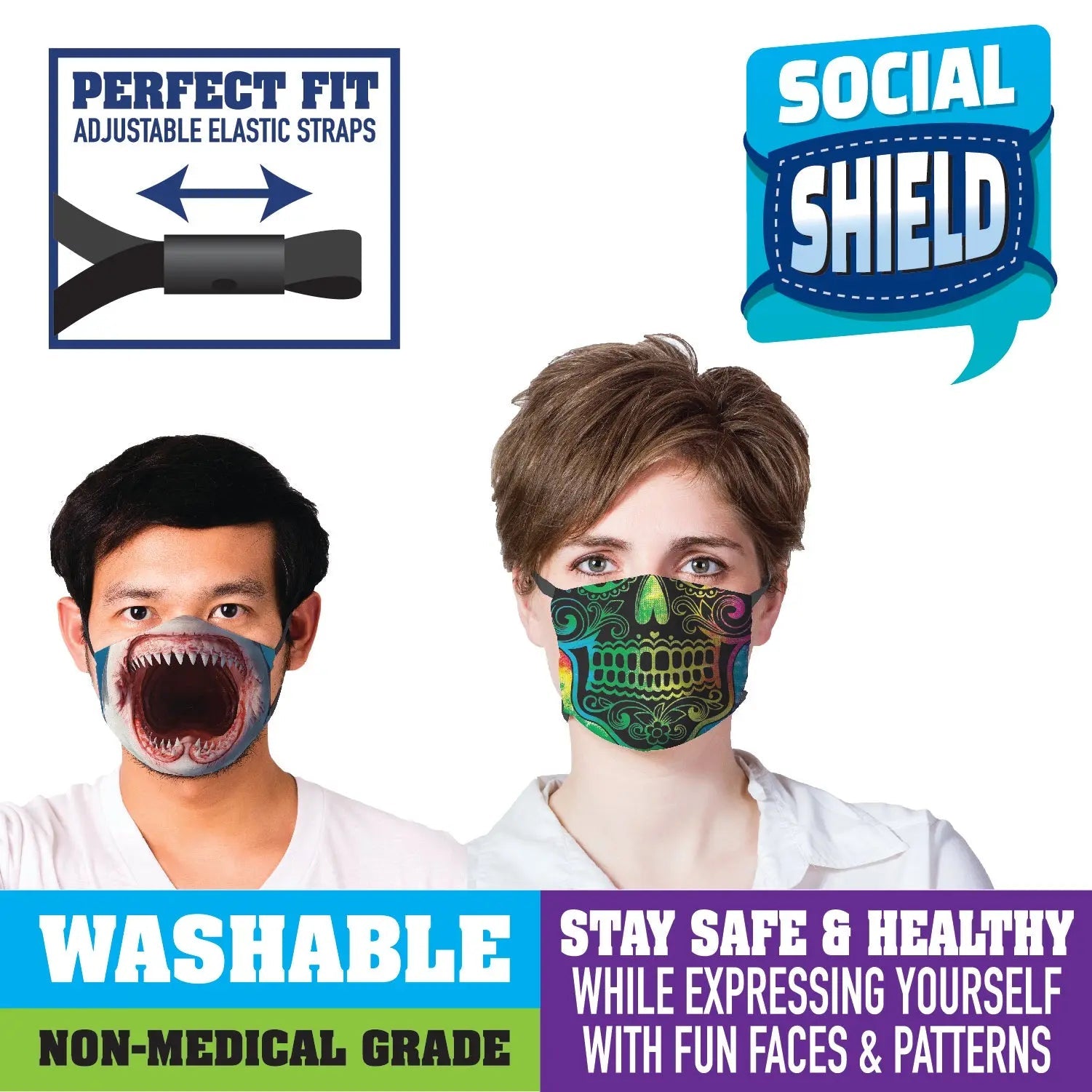 Adult washable polyester printed masks. Comes in assorted designs.