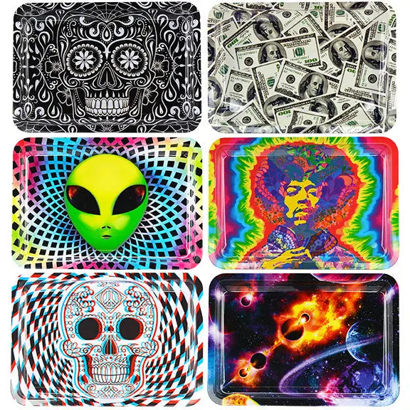 Easy to clean Printed Metal Tray, perfect for rolling your own tobacco, storing keys and more. Comes in assorted designs.