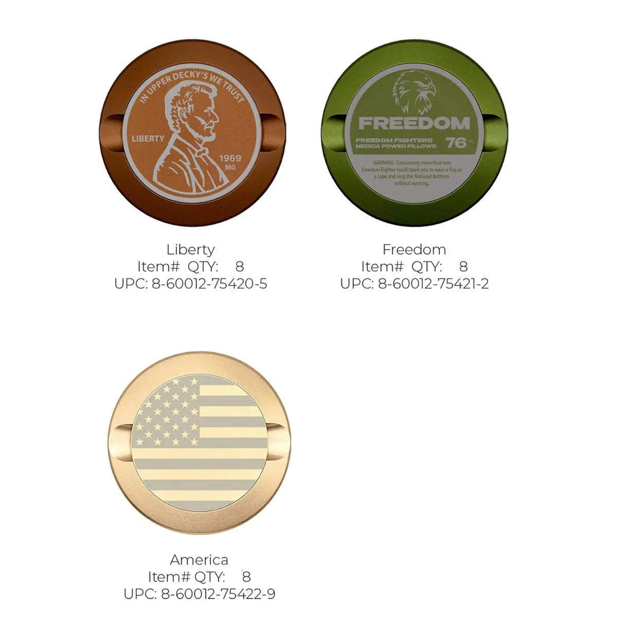 Syn Tin is a sophisticated and refined repository for your oral pouches, nicotine pouches, and snus products. These containers are crafted with an exclusive form factor, featuring expanded capacity, a trash can for used pouches, knurled edges for grip, water-resistant storage, and enhanced anodized coating. Each can is precision laser-engraved with eye-catching patriotic designs that are sure to be a conversation starter wherever you go.