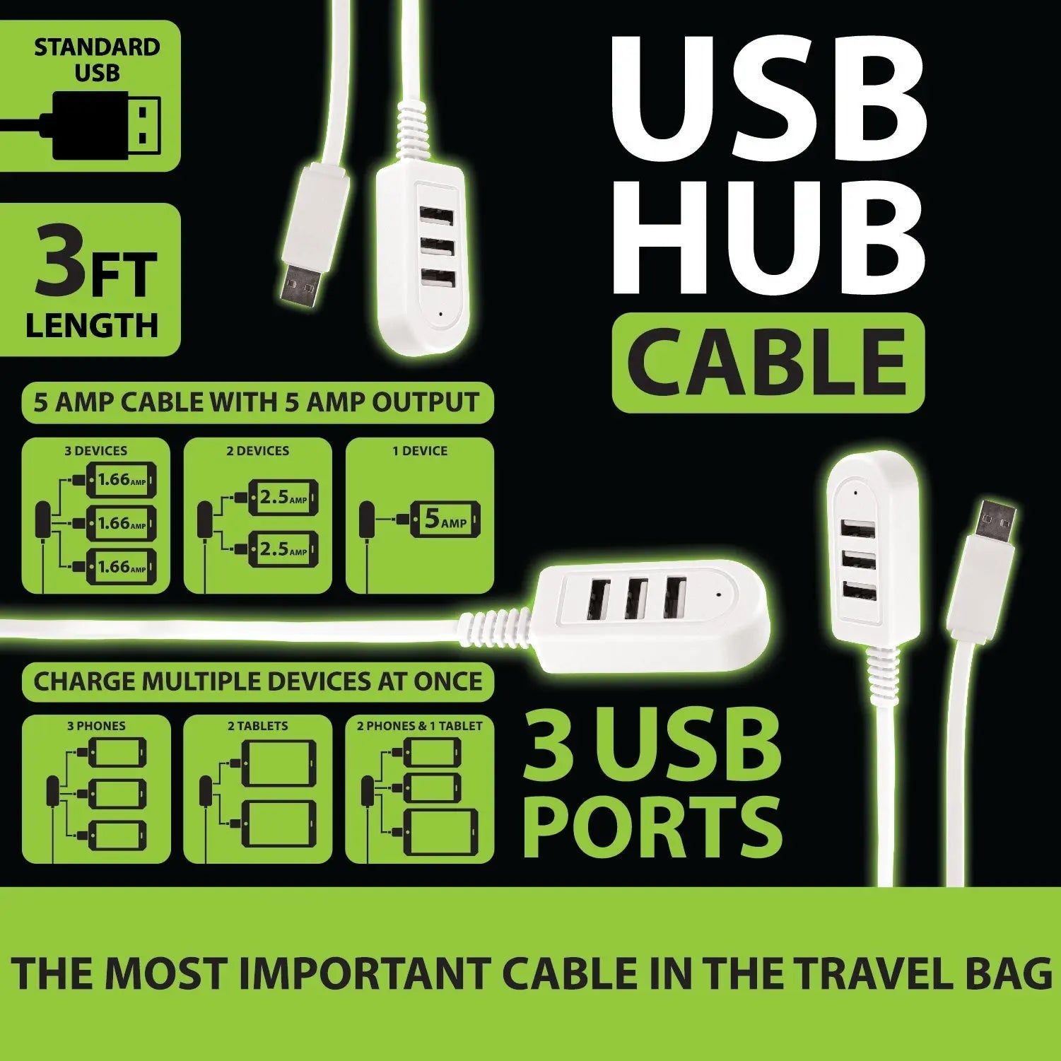 This 5 AMP USB hub charge cable with 3 USB ports allows you to charge up to 3 devices at at a time and with it's 5 Amps of power you can still get charged up fast while you are on the go. Perfect for taking on vacation or business trips.