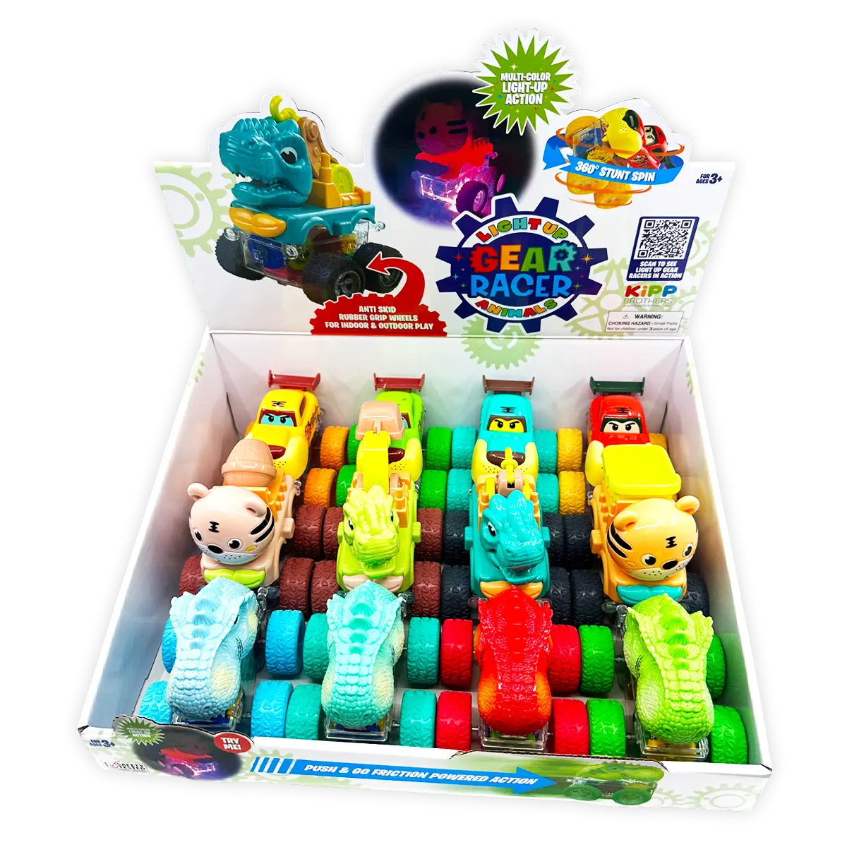 Light Up Vehicle Gear Racers feature multicolor light-up action, push and go friction power and 360º stunt spin! Ages 3+. Assorted colors. Batteries included for light-up action! Anti-skid rubber grip wheels – perfect for indoor AND outdoor play.
